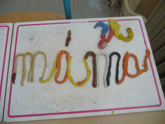 Tak jsme opět vyndali z našich výtvarných kufříků modelínu, pořádně ji promačkali a pustili se do modelování. Tentokrát už jsme zkoušeli písmenka psací a také jsme vyzkoušeli netradiční psaní slov. Jen si přečtěte, co všechno jsme stihli napsat a jak se nám práce dařila…. 🙂
