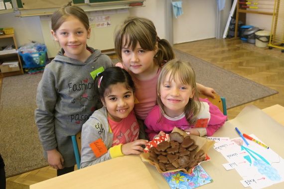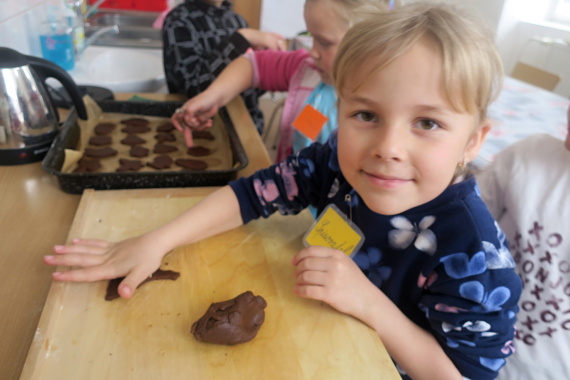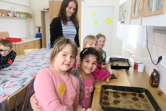 Malí kuchtíci a kuchařinky skvěle zvládli své první školní pečení perníčků. Šikovně vykrajovali formičkami tvary, střídali se u potírání vajíčkem, radovali se, z upečené dobroty. Byli opatrní a poučili se o pravidlech práce v kuchyni a o nezbytném dodržování hygieny při manipulaci s potravinami. Prostě nám to pečení šlo pěkně od ruky, jedna radost.