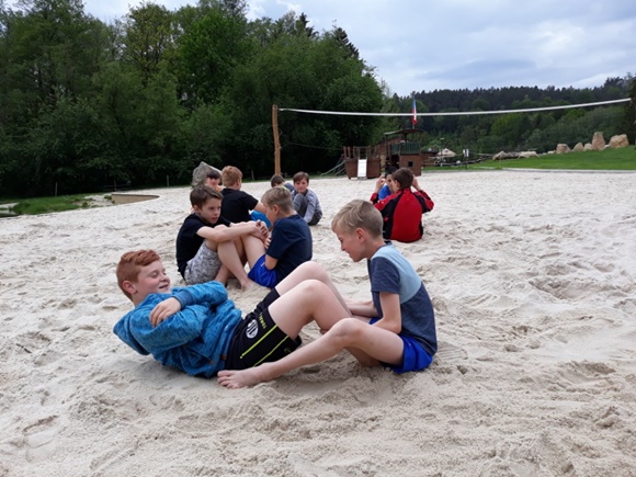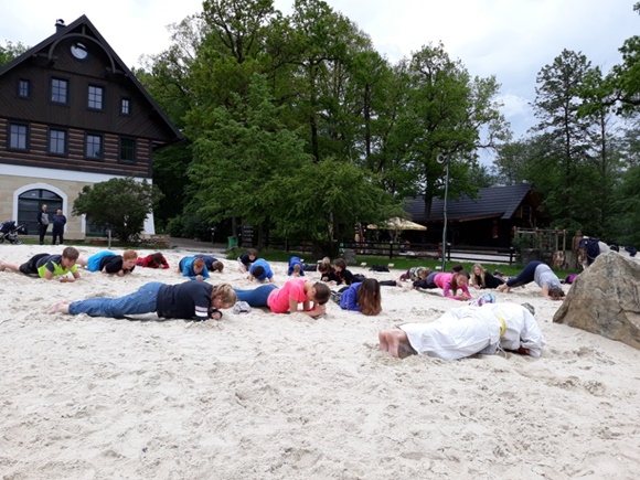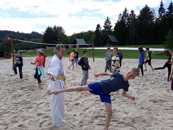 Ve čtvrtek ráno se na nás na chvíli usmálo sluníčko. Rozdělili jsme se do dvou skupin. Neúnavní turisté se v okolí věnovali geocachingu, neboli hledání pokladů podle zeměpisných souřadnic. Ti unavenější hráli společenské či míčové hry na pláži v kempu. Odpoledne za námi přijela trenérka Lenka Horáčková, aby nás naučila základům kondičního cvičení a sebeobrany. Sportovní odpoledne nám opět několikrát překazil déšť, museli jsme proto využít zahradní altán. Večer jsme fanděním podpořili náš tým v hokejovém klání s Německem.