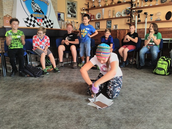 Největší úspěch ovšem sklidila hra Čokoláda (viz foto). V omezeném čase musíte v zimní čepici a rukavicích ukrojit kostičku čokolády dříve než soupeř hodí na kostce šestku. Tu si jistě jěště někdy zahrajeme, třeba ve vánočním čase. Nechyběly ani sportovní aktivity. Kluci (a děvče :-)) měli chvilku na svůj oblíbený fotbal, ostatní hráli na třetího nebo na schovávanou.