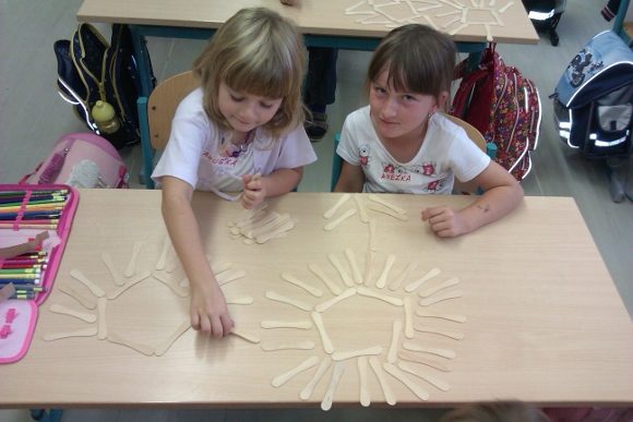 Svou úplně první hodinu pracovních činností měli naši prvňáčci ve středu. Děti spolu moc pěkně pracovaly ve dvojicích, kdy skládaly ze dřívek kytičky a sluníčka. Potom každý sám skládal první písmenko svého jména, někteří dokonce složili i své celé jméno! Na závěr hodiny si každý postavil domeček. Moc nás práce bavila a hodina nám velmi rychle utekla.