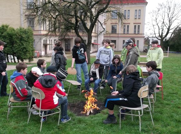Dne 12.4. ve čtvrtek jsme se sešli v 18 hodin před školou. „Spaní ve škole“ jsme zahájili společným opékáním buřtů a klobás na zahradě školy. Během opékání jsme si povídali. Po večeři si někteří kluci zahráli fotbal a ostatní hráli hru „Mrazík“. Než se setmělo, šli jsme do tělocvičny, kde jsme si připravili věci na spaní a hráli jsme kolektivní …