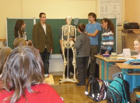 V páté i osmé třídě se v současné době probírá učivo o člověku a stavbě jeho těla. Využili jsme této příležitosti k tomu, aby si osmáci zkusili role učitelů. Vybraná skupinka žáků osmé třídy se řádně připravila, vybavila vědomostmi a cestou do páté třídy si vzala i svého kamaráda – kostlivce.