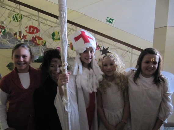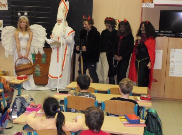 Pátého prosince bylo už v ranních hodinách ve škole rušno. Začali se scházet deváťáci, kteří udělali překvapení pro první stupeň, a připravili si pro ně Mikuláše. S Mikulášem chodil jeden blonďatý andílek, dva čerti a dvě čertice.