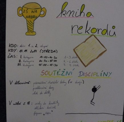 Ano, na Habru se opět soutěžilo a žáci v rámci prvního kola Haberské knihy rekordů podávali opět skvělé výkony. Tentokrát se děti snažily dosáhnout nejlepšího výkonu ve skoku dalekém snožmo, v podlézání kozy, přenášení švédské bedny napříč tělocvičnou či v udržení rovnováhy při figuře čápa. Šikovné ruce si žáci vyzkoušeli při skládání zápalek do krabičky (s jednou rukou za zády) …
