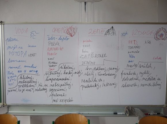 Ve výtvarné výchově v 6.A jsmě se zabývali živly. Nejprve jsme pracovali s pojmy. na tabuli jsme si udělali brainstroming k jednotlivým živlům a pokusili jsme se k jednotlivým živlům přiřadit povahu člověka. Každý si potom intuitivně zvolil živel, který je mu blízký.