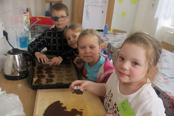 Malí kuchtíci a kuchařinky skvěle zvládli své první školní pečení perníčků. Šikovně vykrajovali formičkami tvary, střídali se u potírání vajíčkem, radovali se, z upečené dobroty. Byli opatrní a poučili se o pravidlech práce v kuchyni a o nezbytném dodržování hygieny při manipulaci s potravinami. Prostě nám to pečení šlo pěkně od ruky, jedna radost. Odpoledne děti prožily společně se svými blízkými na velikonočních …