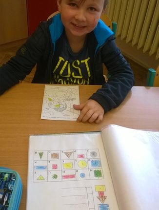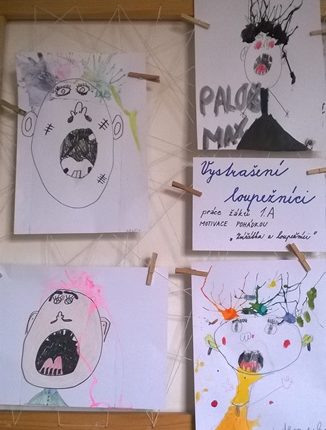 O výtvarné výchově nám paní učitelka přečetla pohádku Zvířátka a loupežníci. Byla napínavá a trochu legrační – zejména, když jsme předváděli vyděšené loupežníky, kteří se nechali od zvířátek pořádně napálit. Obrázky k ilustraci se nám moc povedly.