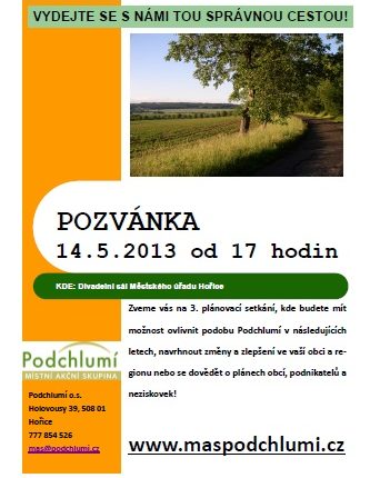 Přijměte pozvání na 3. veřejné plánovací setkání, které se bude konat v úterý 14.5.2013 od 17 hodin v Divadelním sále MěÚ Hořice. Cílem tohoto setkání bude tvorba nové strategie pro programovací období 2014-20. Přijďte se s námi podělit o Vaše podněty a připomínky, co by pro Vás MAS měla v příštích letech dělat a čím by měla náš region obohatit.