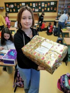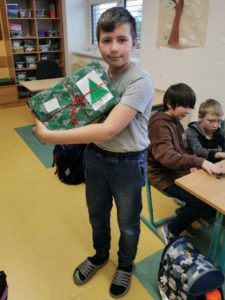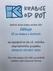 Jde o každoroční charitativní vánoční akci, do které jsme se v rámci školního projektu “Pomáháme” zapojili i my z 5.A. Sbírku pořádá Diakonie ČCE, která má v našem kraji sběrné místo třeba v Jičíně. Cílem je potěšit děti z chudších rodin v České republice naplněnou krabicí od bot dárky a hračkami, které už třeba sami nevyužijeme. Dárečky jsme doma vybrali, krabice jsme ve škole naplnili a zabalili a připojili vlastnoručně vyrobená přáníčka. Na oplátku jsme obdrželi diplom s poděkováním, ale především máme hezký pocit, že třeba někomu uděláme pod stromečkem radost.