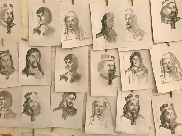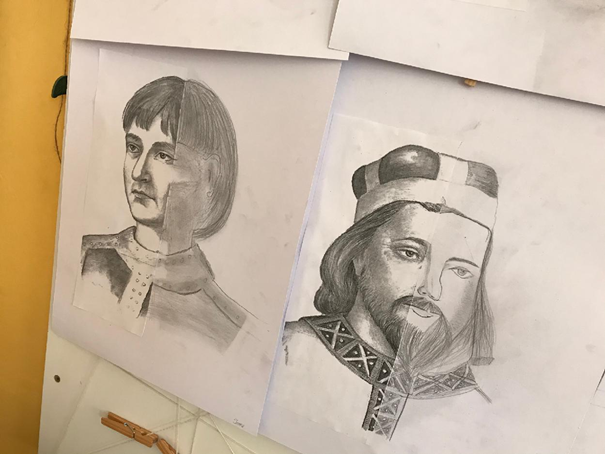 Prvních Přemyslovců se ve 4. třídě také nezalekli. Děti si vyzkoušely dokreslit portréty prvních přemyslovských knížat. Poznáte sv. Václava, jeho bratra Boleslava nebo třeba manželku Bořivoje sv. Ludmilu?