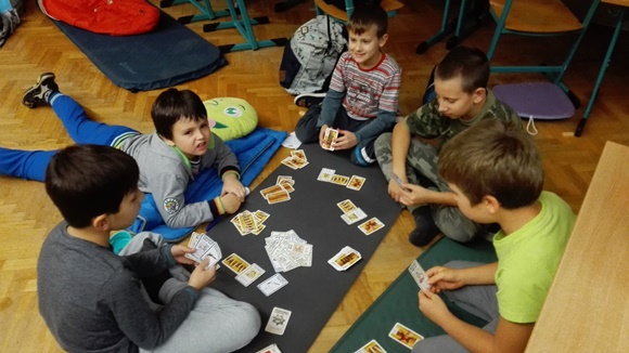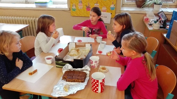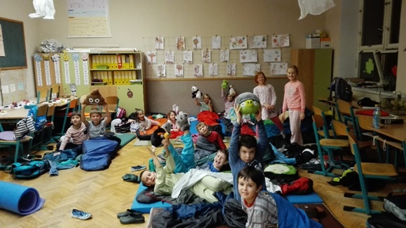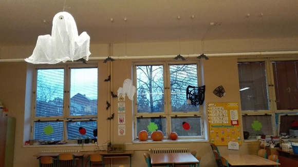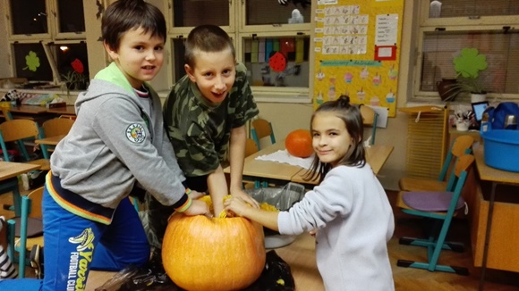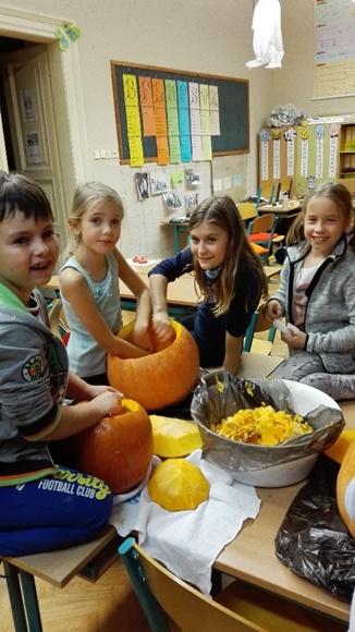 Všichni jsme se společně sešli v naší třídě v 5 hodin odpoledne, abychom si připomněli svátek Halloween. Čekala na nás strašidelná třída, vyzdobená netopýry, pavouky a létajícími duchy. Společnými silami jsme vydlabali dýně, vytvořili si vlastní modelovací hmotu na tvoření a po večeři nás čekala stezka odvahy. Všichni jsme si večer ve škole užili a druhý den na nás čekala velká hostina, kterou pro nás připravili rodiče. Moc děkujeme všem rodičům za dobroty. Dále děkujeme paní Dobešové a paní Laporte za dýně.