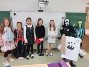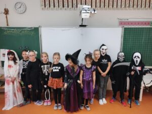 Dne 25.10. proběhl na naší škole Halloween. Děti mohly přijít převlečené nejen za upíry, klauny, strašidelné a nadpřirozené bytosti, ale také ve spoustě různých kostýmů. V tomto případě platilo heslo – originalitě se meze nekladou. Moc děkujeme všem, kteří se této akce zůčastnili a dali si záležet na krásných a vyjímečných kostýmech. Zvláštní poděkování patří dětem a vyučujícím ze školní družiny za krásnou výzdobu šaten. Už teď se moc těšíme na další akce…