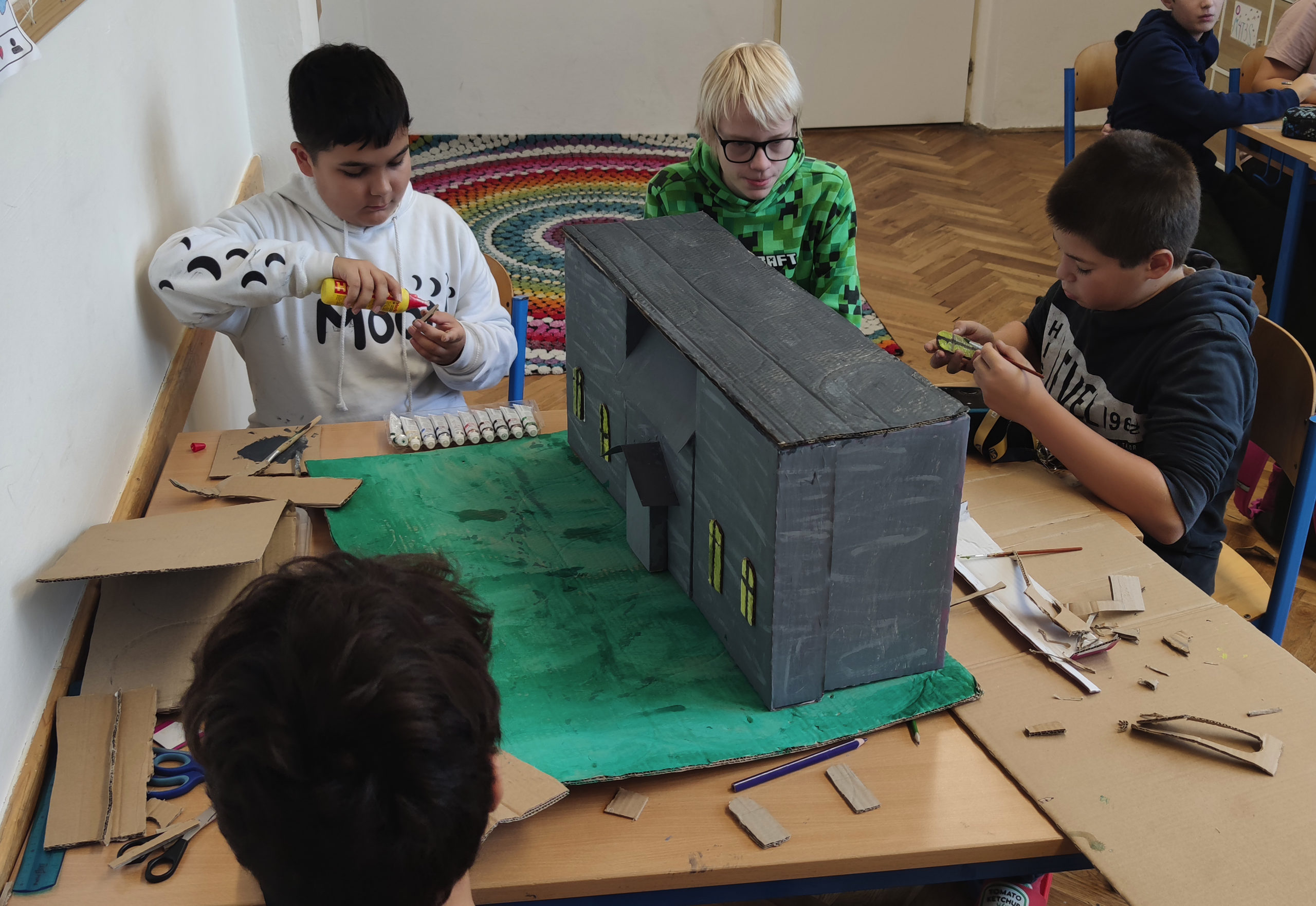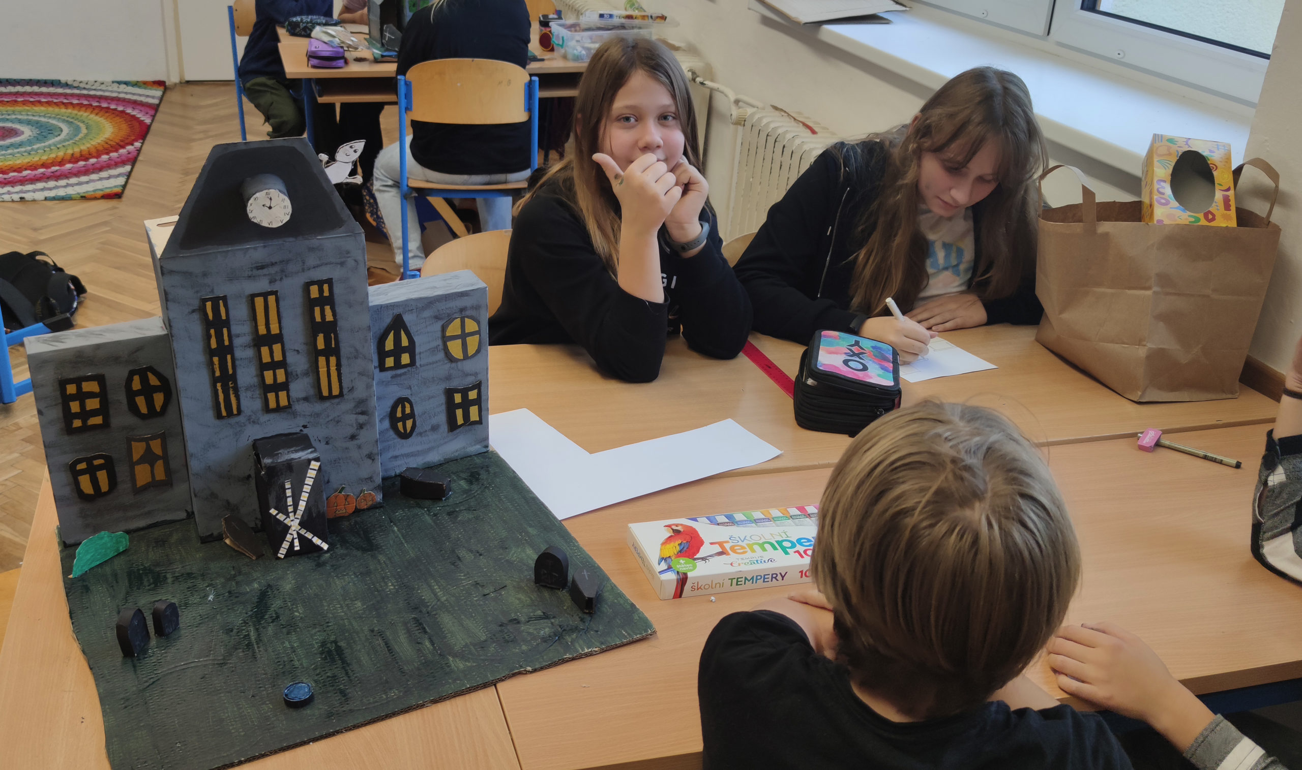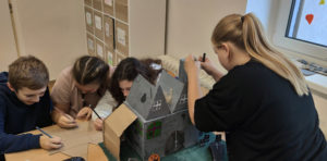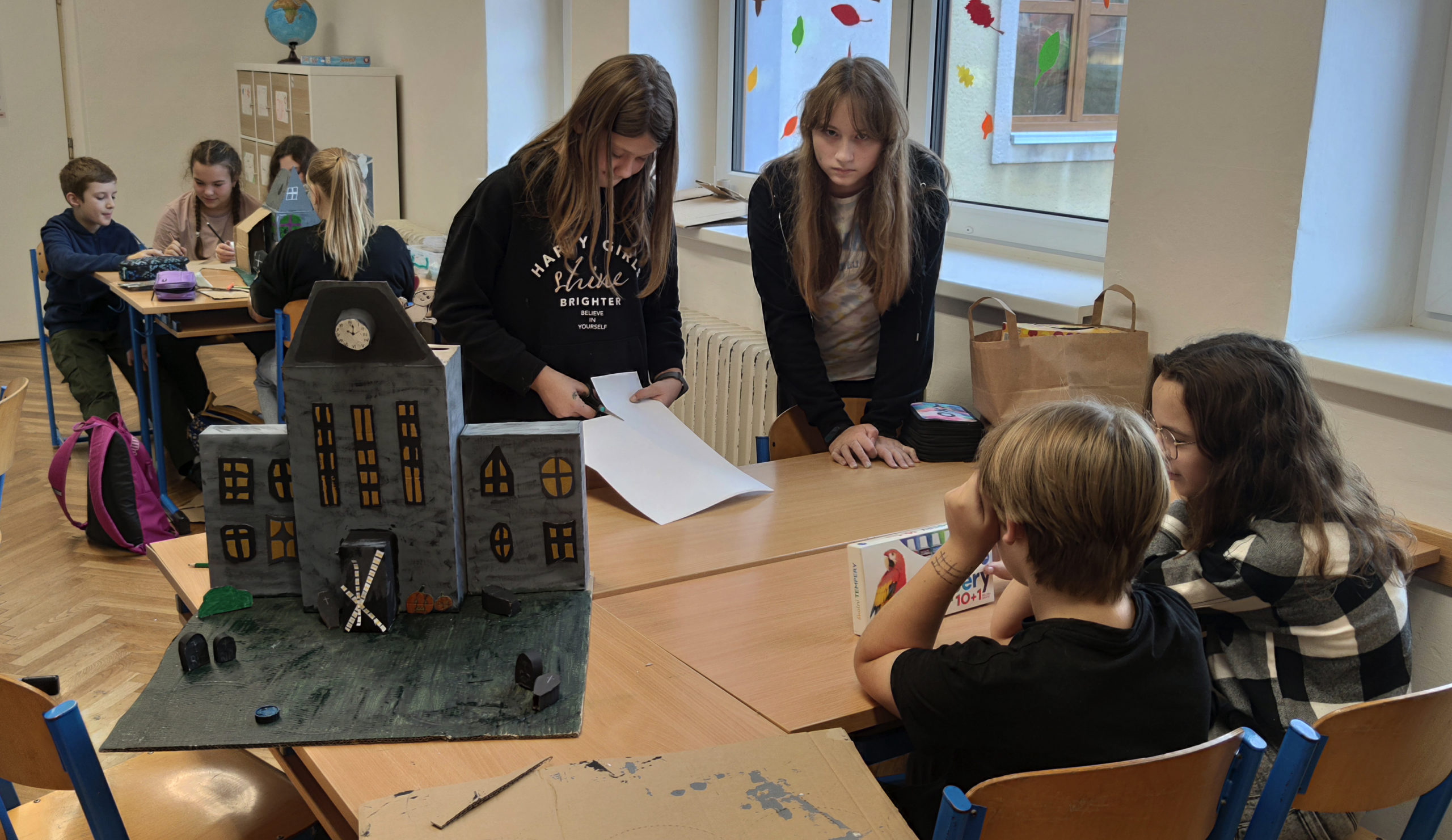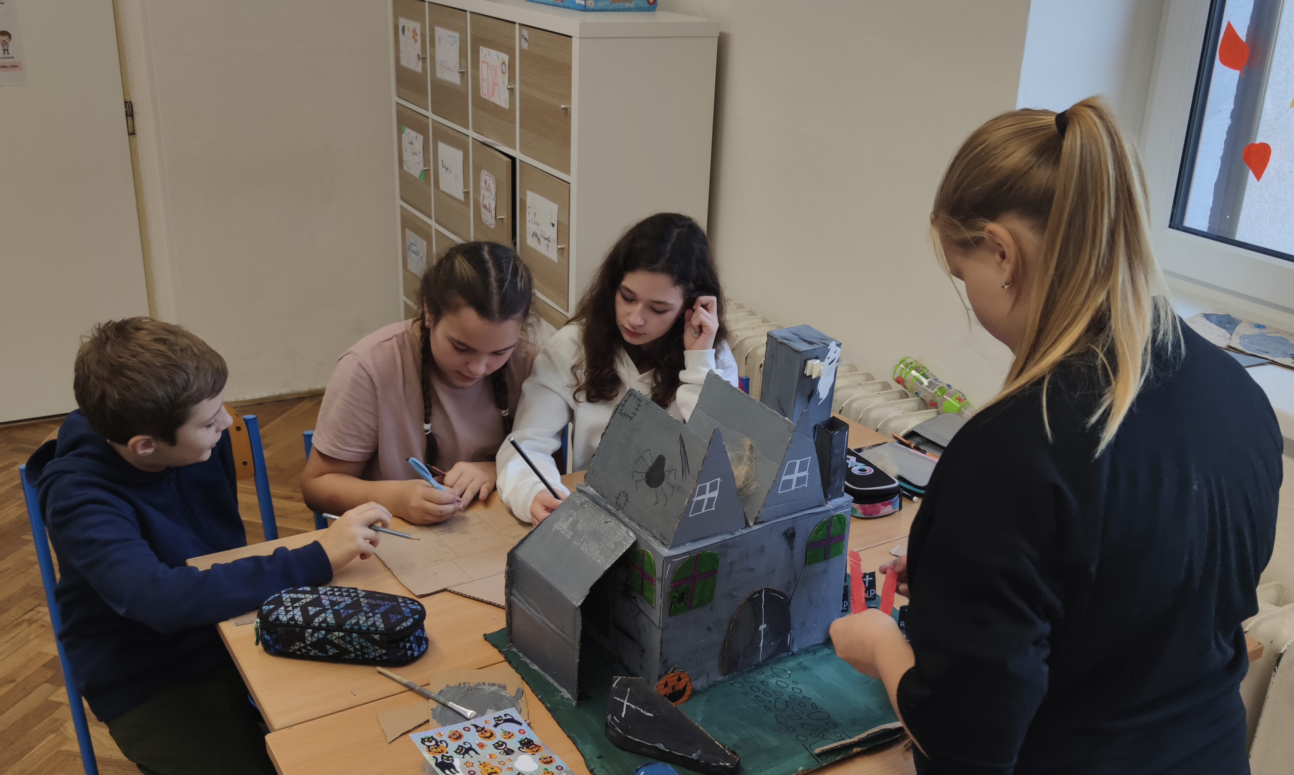 Šesťáci se během projektových dní konaných 24. a 25. října dozvěděli několik důležitých informací o svátku Halloween. Snažili se porozumět mluvenému anglickému dokumentu, doplnit chybějící slova v psaném textu a veškeré informace přeložit. Zazpívali si také anglickou písničku o strašidelném domě s duchy a naučili se slovíčka podstatná pro vlastní kreativní projekt „strašidelný dům“. Nakonec se rozdělili do skupin a zahráli si na architekty. Každá skupina vytvořila svůj vlastní strašidelný dům, který bude dále využíván na hodinách anglického jazyka pro výuku předložek, místností a vybavení. Dvoudenní projektové vyučování jsme zakončili Kiva lekcemi na podporu dobrých vztahů v kolektivu.
