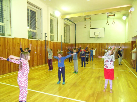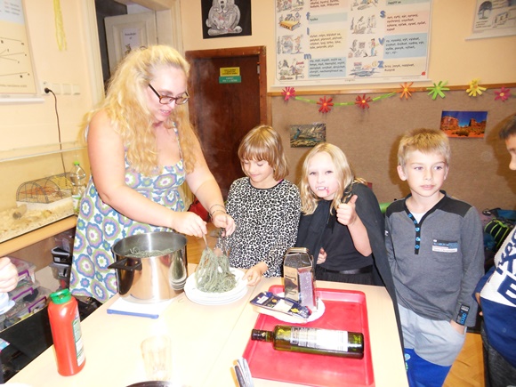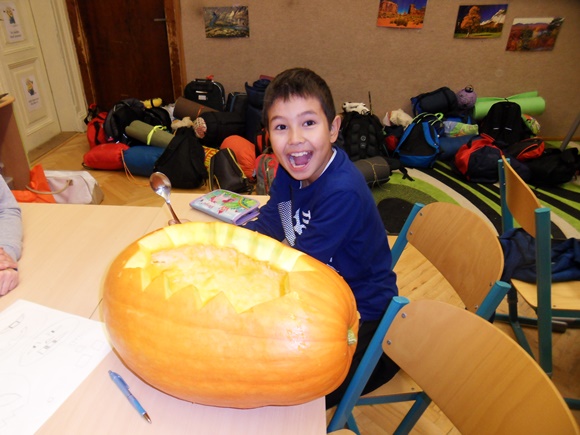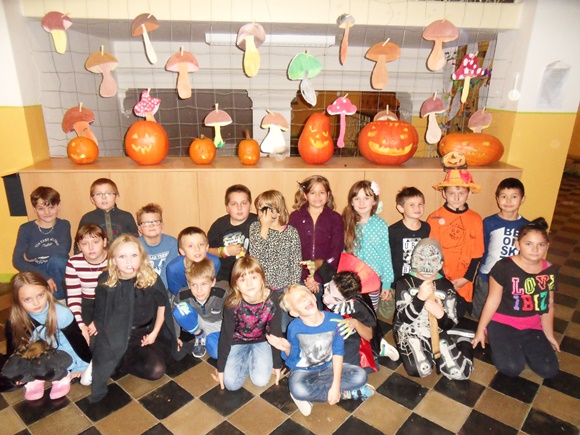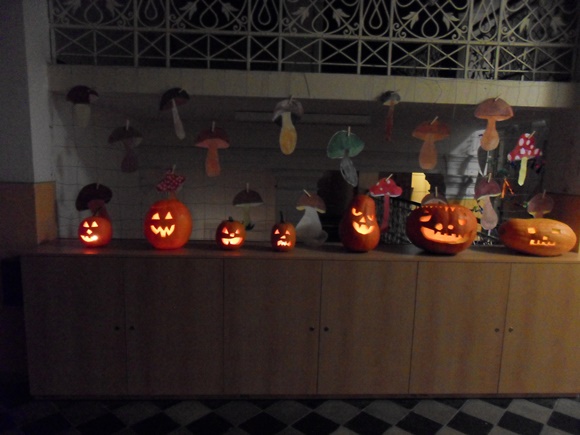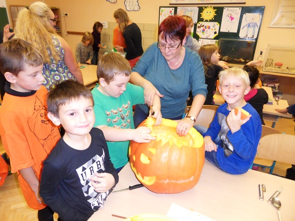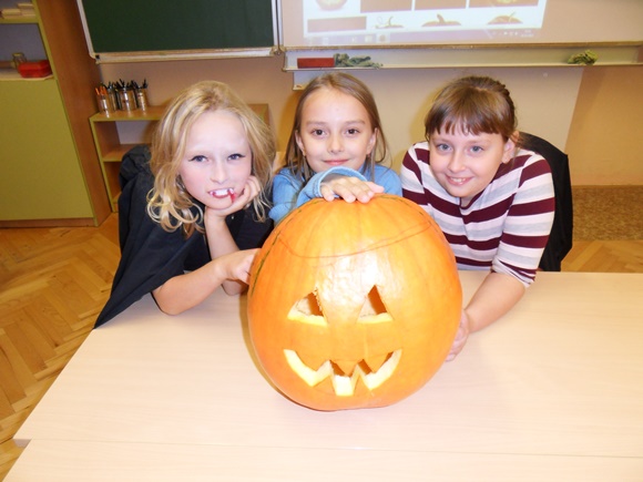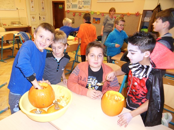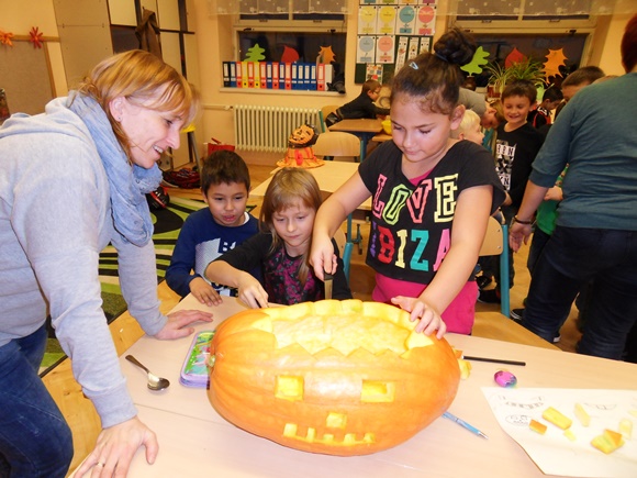 Nejdříve nám přišli na pomoc rodiče, protože byla potřeba dohlédnout na vyřezávání dýní, aby se nikomu nic nestalo. Vyřezávání se nám opravdu povedlo, a dýně několik dní zdobily školní chodbu. Kdo chtěl, mohl tento večer přijít v masce, anebo si tady ve škole nechat namalovat něco na obličej. Paní Holmanová nám připravila vskutku halloweenskou večeři, a to černozelené špagety se sýrem a krvavým kečupem. Přitom jsme mohli zhlédnout tematickou pohádku – Hotel Transylvánie. Když už byli všichni správně naladění, šlo se na stezku odvahy, která vedla z patra dolů až na konec šaten. Po cestě na někoho čekala oprátka, kostlivec, duch, ale nakonec i odměna a diplom. Poté už si všichni jen vyčistili zuby, převlékli se do pyžam a šlo se na kutě.