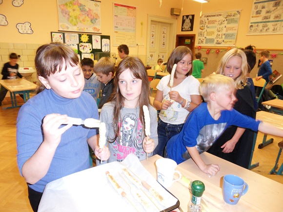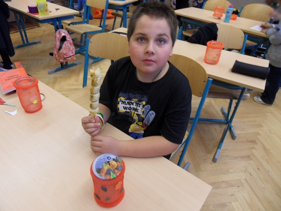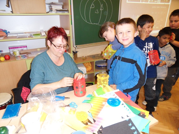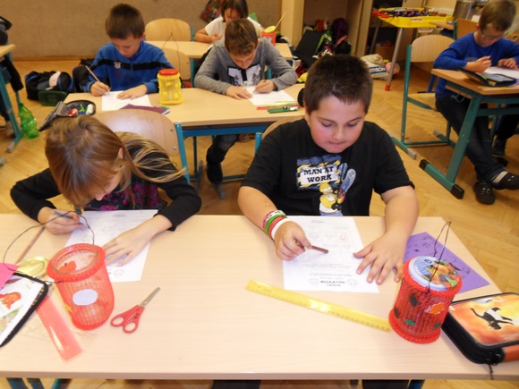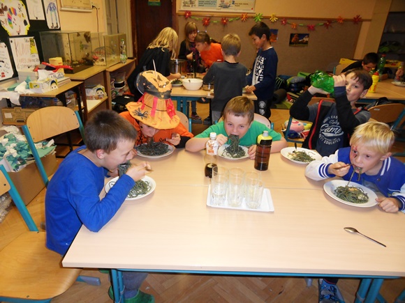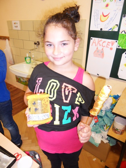 Druhý den jsme vyskočili s pelíšků, uklidili si, vyčistili si zuby a posnídali dobroty, které nám rodiče přichystali. Tímto rodičům velmi děkujeme J Tím však halloweenský den teprve začínal. Jako první jsme šli péct svačinu – babské pařáty a také párky obalené listovým těstem na špejli. Když se to všechno pěkně peklo v kuchyňce, vyráběli jsme halloweenské lucerny, které byly ze zavařovacích lahví, drátěnky a barevných doplňků. Co by to ale bylo za školu, kdyby nedošlo také na počítání nebo čtení? Děti se proto rozdělily do skupinek po 4 a měly za úkol přečíst si strašidelný příběh a vyplnit pracovní list. Někdo stihl i pavučinu, kterou musel narýsovat dle pravítka apod. Nechybělo ani vyprávění o Halloweenu a porovnání s našimi Dušičkami.
