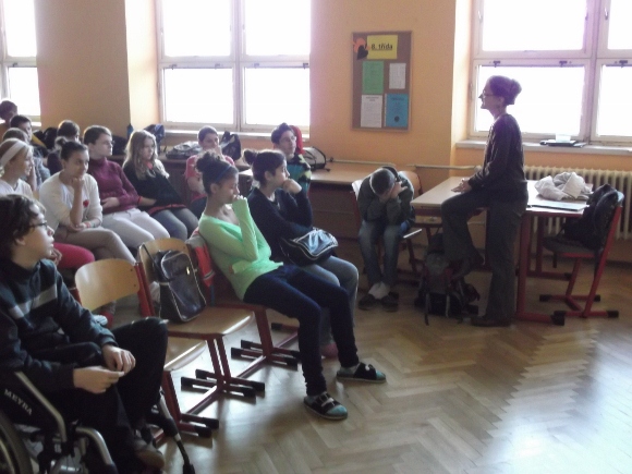 Dnes probíhala výuka dějepisu v 8. a 9. třídě netradičně. Všichni žáci se sešli společně v jedné učebně, aby se zúčastnili přednášky Mgr. Terezie Dubinové na téma Holocaust. Námět nebyl vybrán náhodně. Město Hořice si právě letos připomíná 70. výročí odsunu Židů z Hořic a okolí.