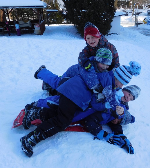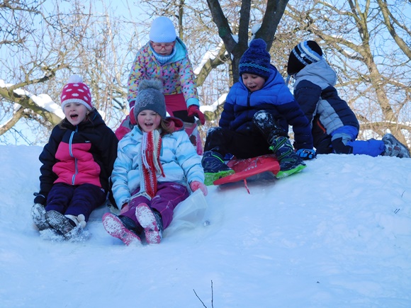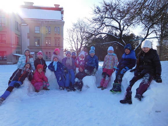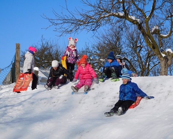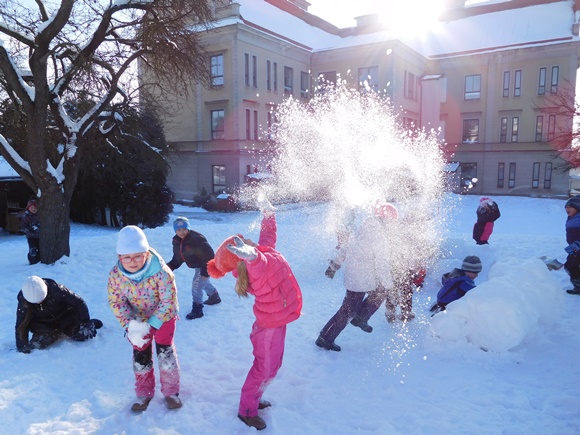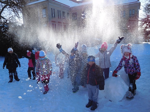 Nemusíme na hory, na školní zahradě si užíváme sněhové nadílky do sytosti.
