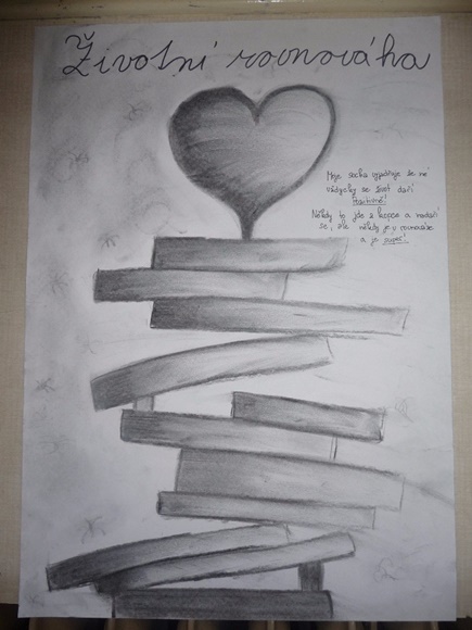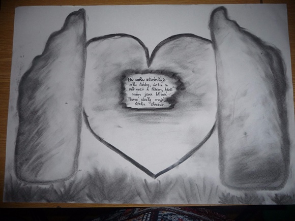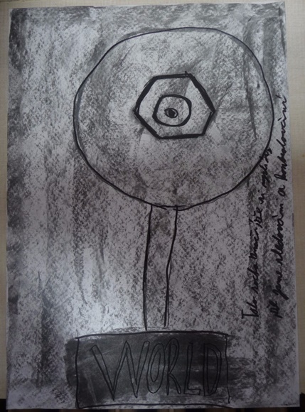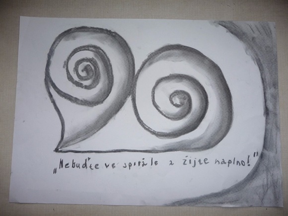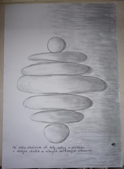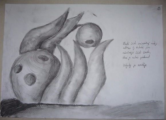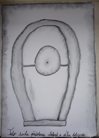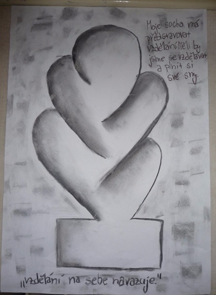 Žáci měli za úkol vytvořit návrh pro pískovcovou abstraktní sochu a vnímat, že výtvarné umění je jistým druhem komunikace, podobně jako řeč. Takhle „promlouvali“ osmáci (kresba černým přírodním uhlem).