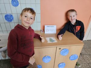 Zkrátit si dlouhou chvíli, vyzkoušet manuální zručnost nebo trochu potrápit hlavičky mohou naši žáci i o přestávkách. Na chodbách školy na ně totiž čekají různé hry a skládanky, aktuálně se zimní tematikou. Hrajeme si ale celý rok, hry průběžně obměňujeme a těší nás, že si své fanoušky našly mezi malými i velkými Haberáky.