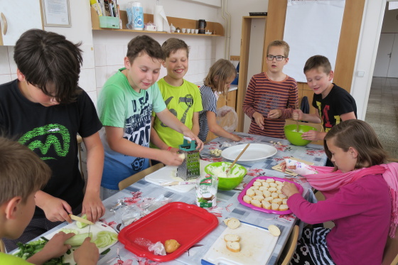 Páťáci se před zahájením stačili ještě podělit o práci v naší školní kuchyňce a pro své blízké připravili skvělé pohoštění v podobě velmi chutných minichlebíčků.