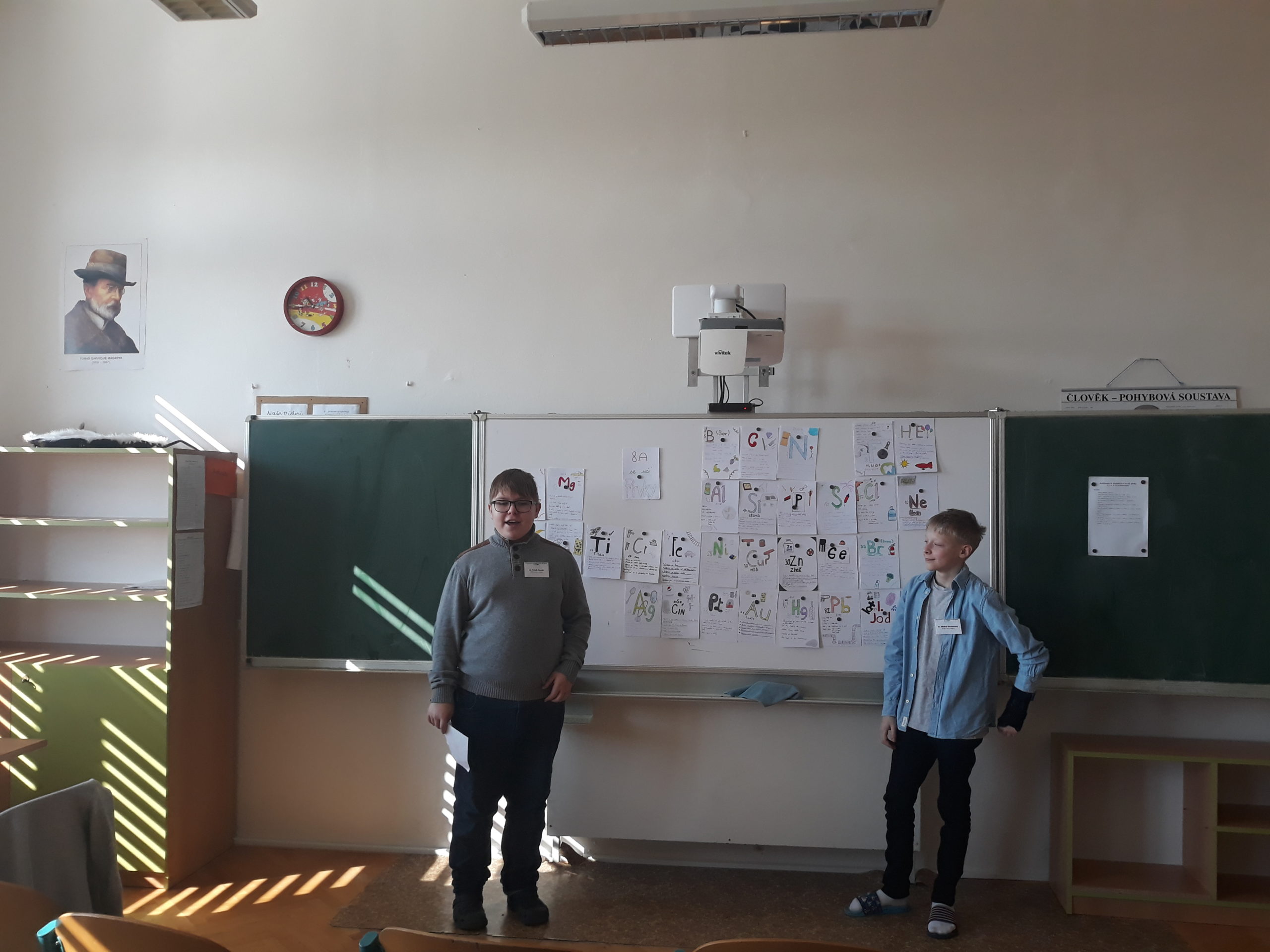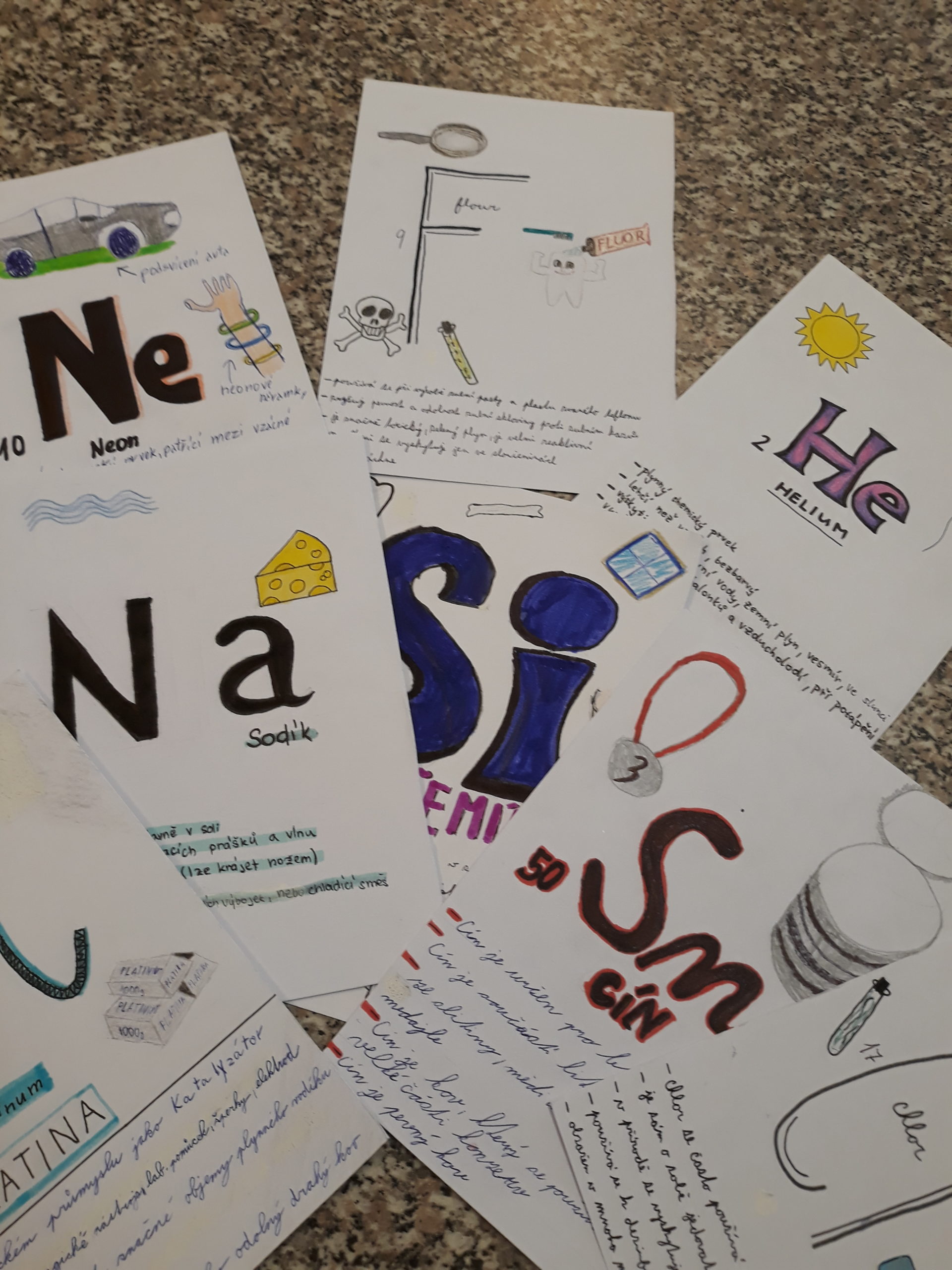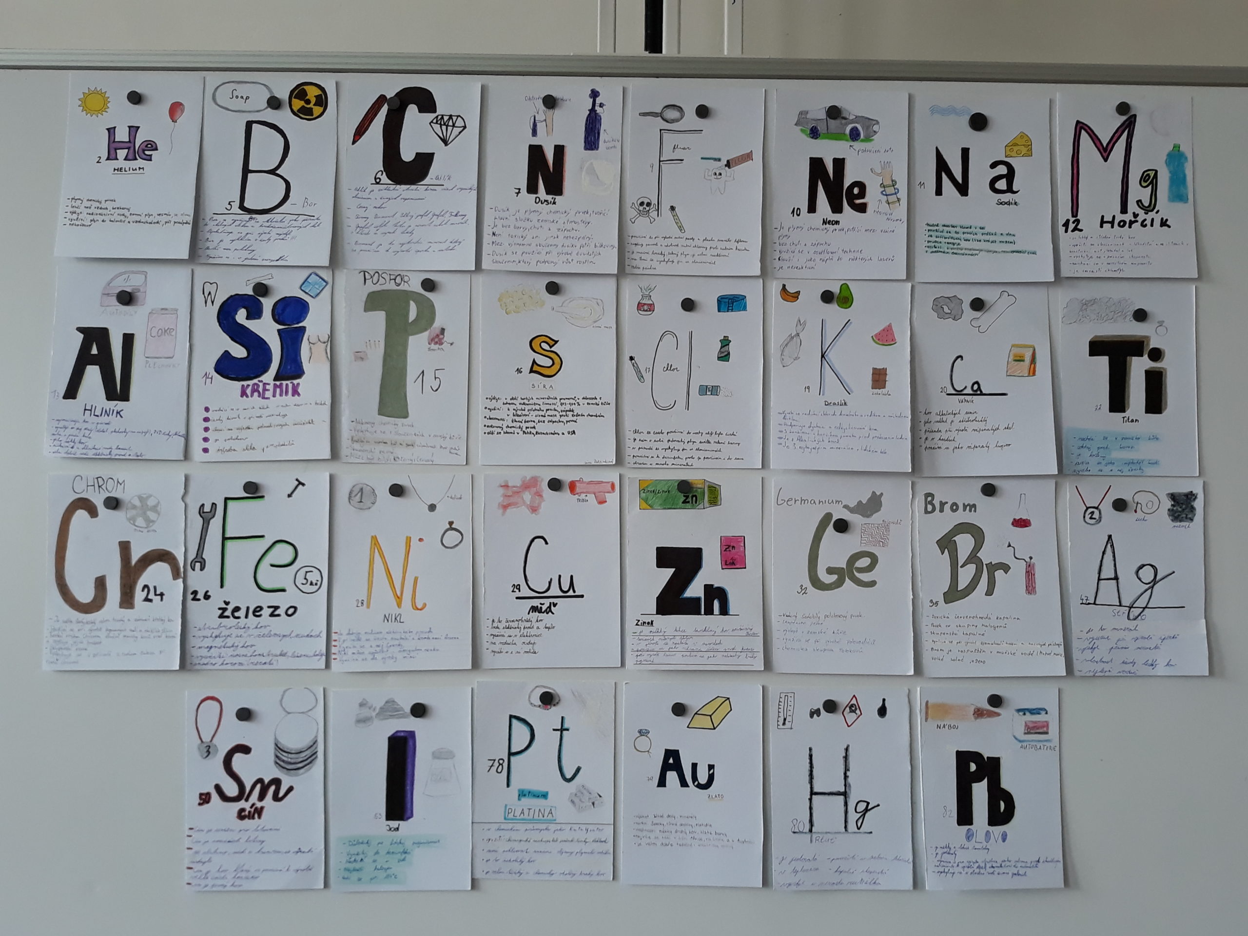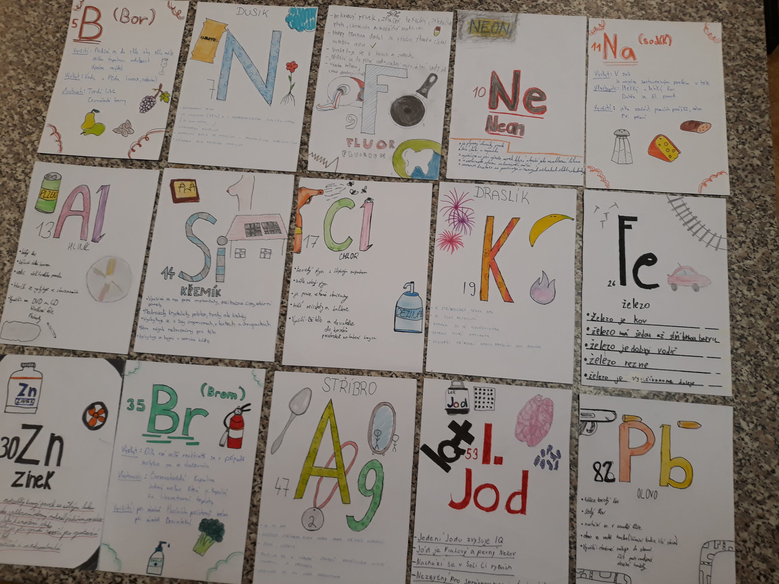 Je to již nějaký ten pátek, co žáci 8. tříd dostali do rukou dopis s prosbou o spolupráci chemickému velikánovi D. I. Mendělejevovi. Jelikož se ale osmáci výzev nebojí, s vervou se pustili do práce na “učebnici” chemických prvků. Nejprve si rozdělili úkoly tak, aby pokryli ty nejznámější prvky, které v periodické tabulce můžeme najít. Potom už vyhledávali a zpracovávali informace na přehledné karty, které doplnili o obrázky charakterizující tyto prvky.