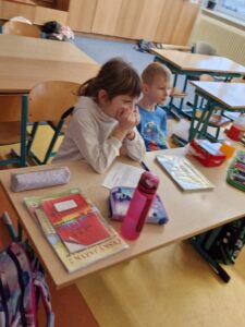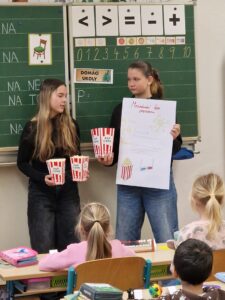 Již v listopadu v rámci hodin výtvarné výchovy žáci vyrobili záložky do knížek, které prodávali na adventních trzích pořádaných na naší škole. Výtěžek z jejich prodeje byl použit právě na nákup popcornu. Poté si v lednu připravili informativní plakáty se zajímavostmi o popcornu.