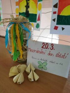 Ve středu 20. března se po celém světě slavil Mezinárodní den štěstí. Prvňáčci se rozhodli tento den oslavit tím, že rozdávali štěstí v naší škole. Díky tomu mohou žáci nalézt na chodbě sklenici plnou koláčků štěstí, ve kterých se ukrývají vzkazy. Pro učitele zase vytvořili sovičky pro štěstí.