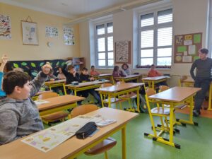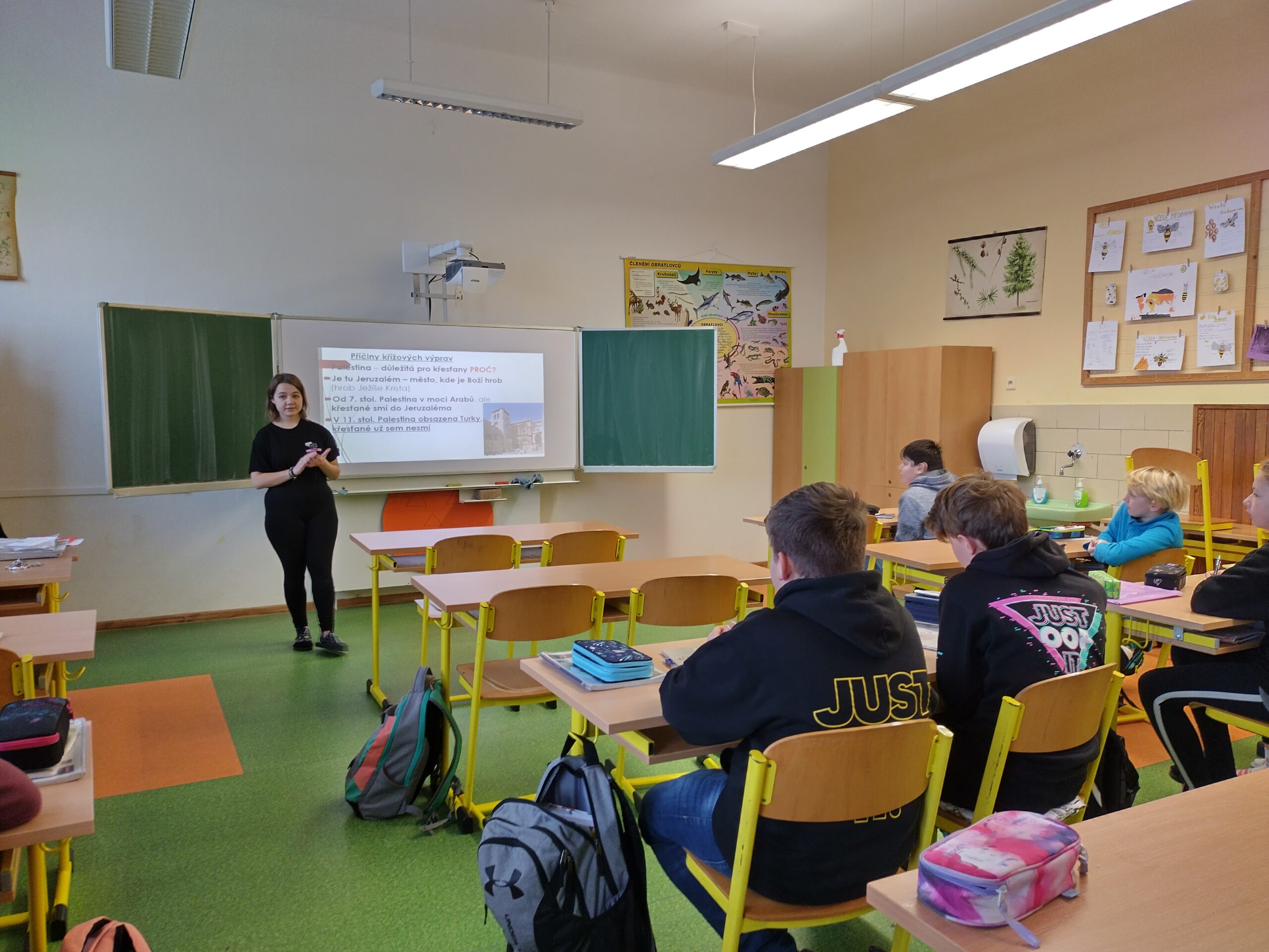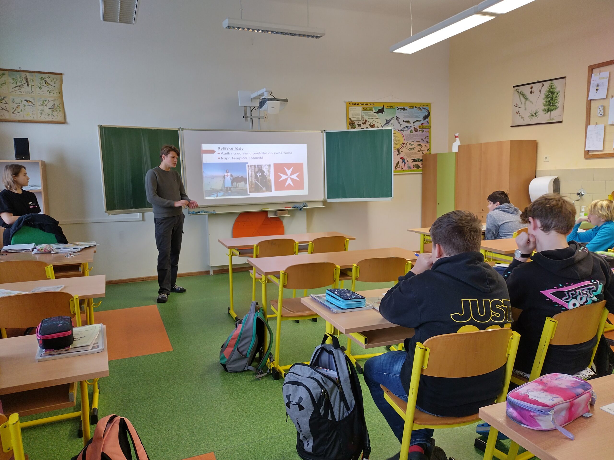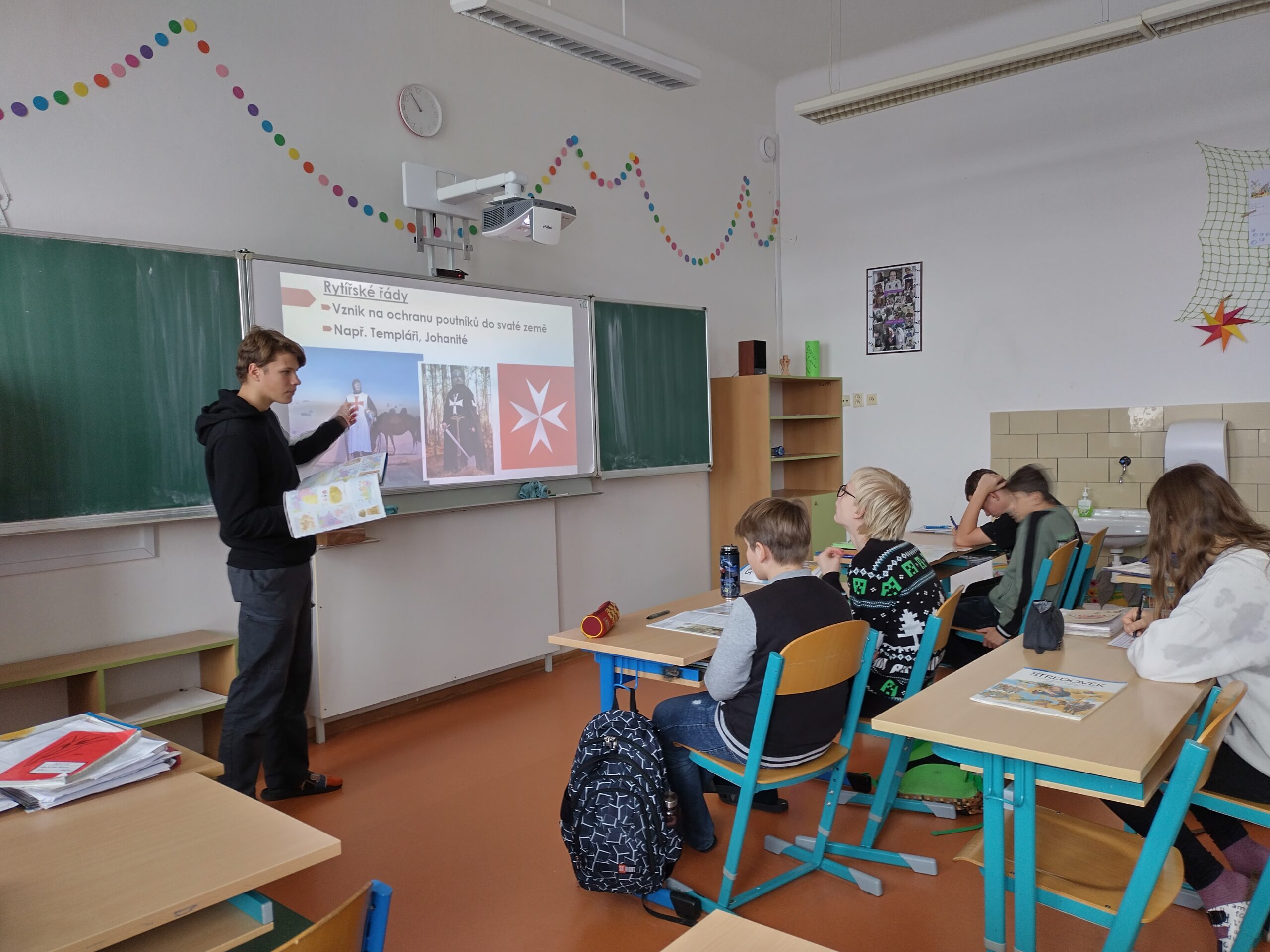 Tento týden si žáci 8. B Vojta a Kačka vyzkoušeli roli učitelů. Pro své spolužáky si připravili hodinu dějepisu na téma křížové výpravy. Do své výuky zahrnuli práci s dějepisným atlasem, doplňovačku nebo opakovací tenis. A výsledek? Osmáci získali nové zkušenosti a sedmáci si užili výuku se staršími spolužáky.
