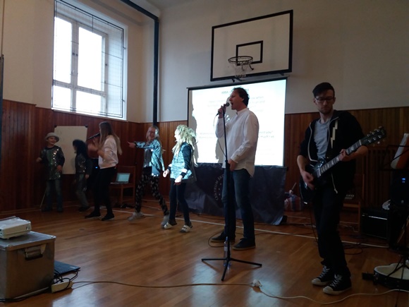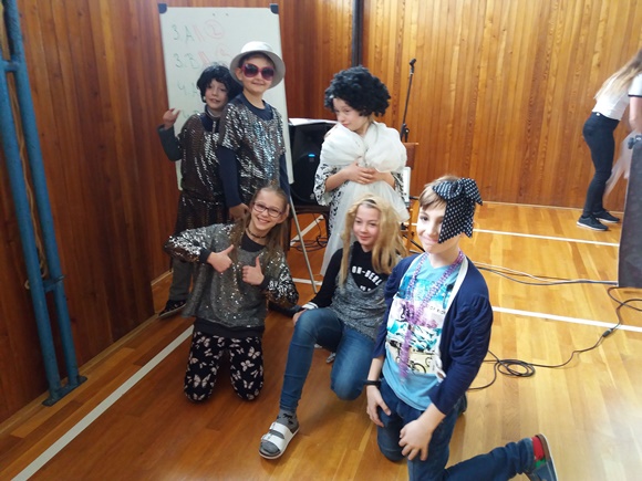 V pátek nás čekala netradiční hodina angličtiny. Navštívil nás Marv z Nového Zélandu se svojí kapelou, aby dětem přiblížil největší hvězdy populární hudby druhé poloviny 20. století. Show to byla velkolepá, zpívalo se a tančilo, dokonce někteří žáci se mohli proměnit ve známé tváře: Arethu Franklin,Fredieho Mercuryho, Madonnu a další. Jednotlivé třídy mezi sebou soutěžily ve znalostním kvízu, který se týkal hudebních ikon amerických i britských. Vystoupení bylo plné překvapení a nečekaných zvratů a i po hudební stránce to byl velký zážitek. To je možná důvod, pro si mnohé děti ještě o víkendu doma zpívaly “We will rock you”.