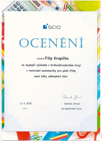 Gratulujeme Filipu Krupičkovi z 5.B, který obsadil v letošním testování žáků pátých ročníků z matematiky první příčku v celém Královhradeckém kraji!