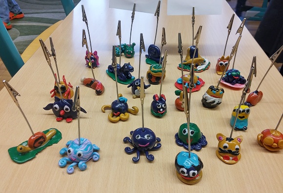 V lednu jsme se pustili při pracovních činnostech do práce s Fimo hmotou. Nejprve jsme se si ozdobili kávové lžičky, v dalších hodinách jsme si troufli na výrobu vlastních držáků na poznámky, tzv. memo clips.