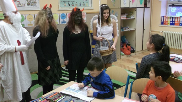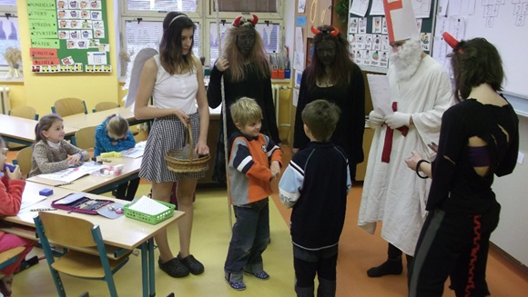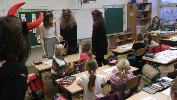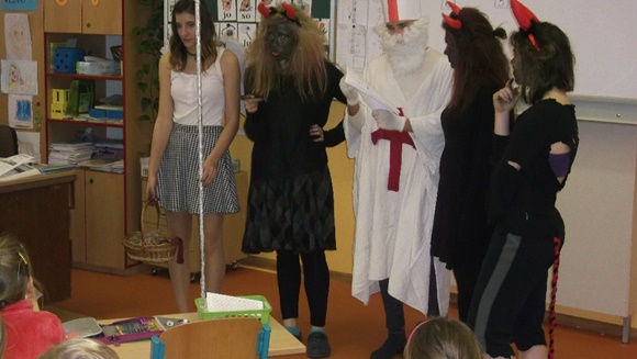 I letos navštívili naši školu čerti s Mikulášem a andělem. Obešli zejména třídy I. stupně, kde se zajímali o děti, které během roku zlobily nebo byly naopak velmi hodné. Vyzkoušeli se je i ze znalostí básniček či písniček, za což byly děti odměněny. Nakonec vše dobře dopadlo a všechny děti zůstaly ve škole.