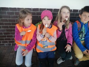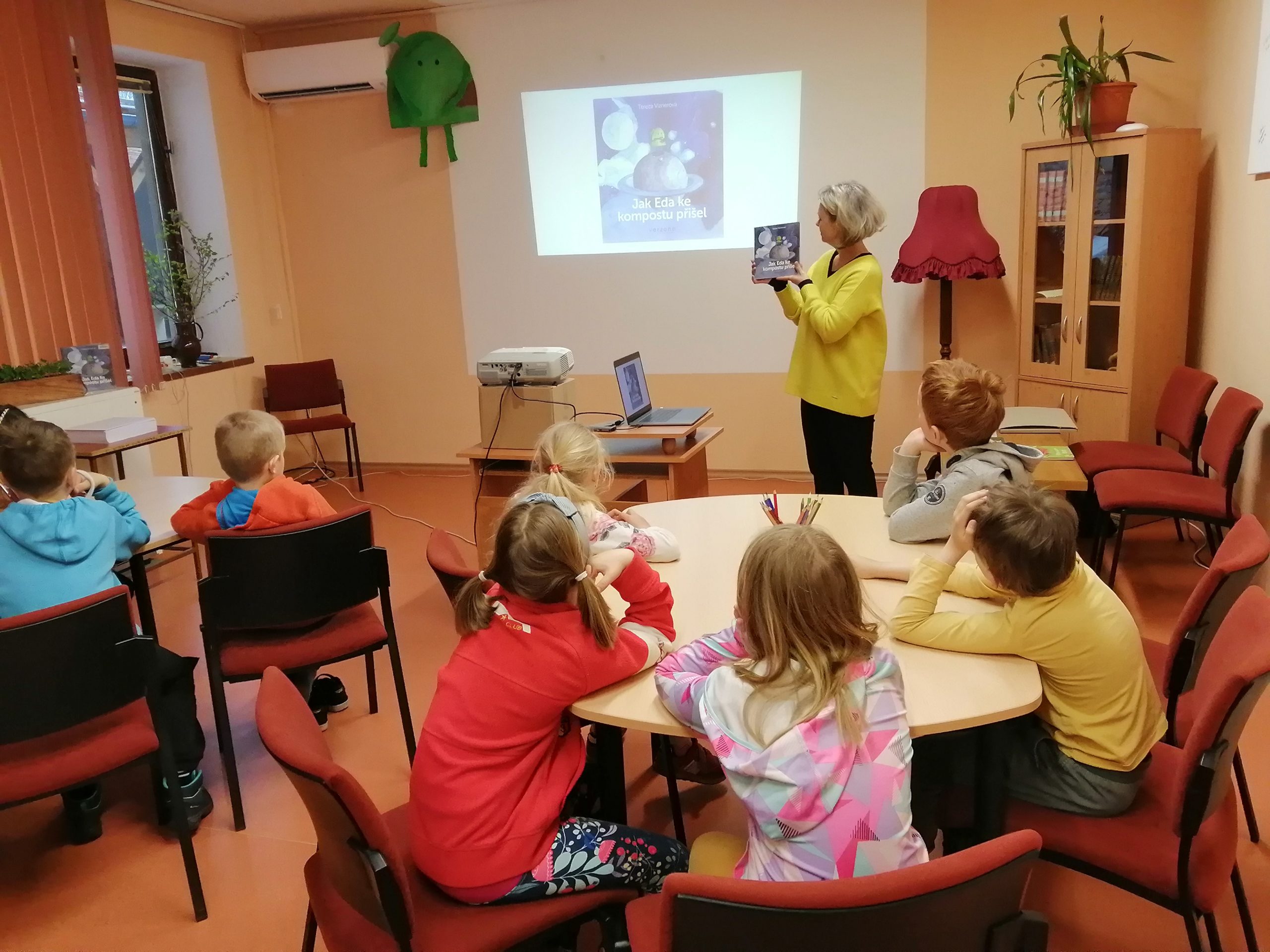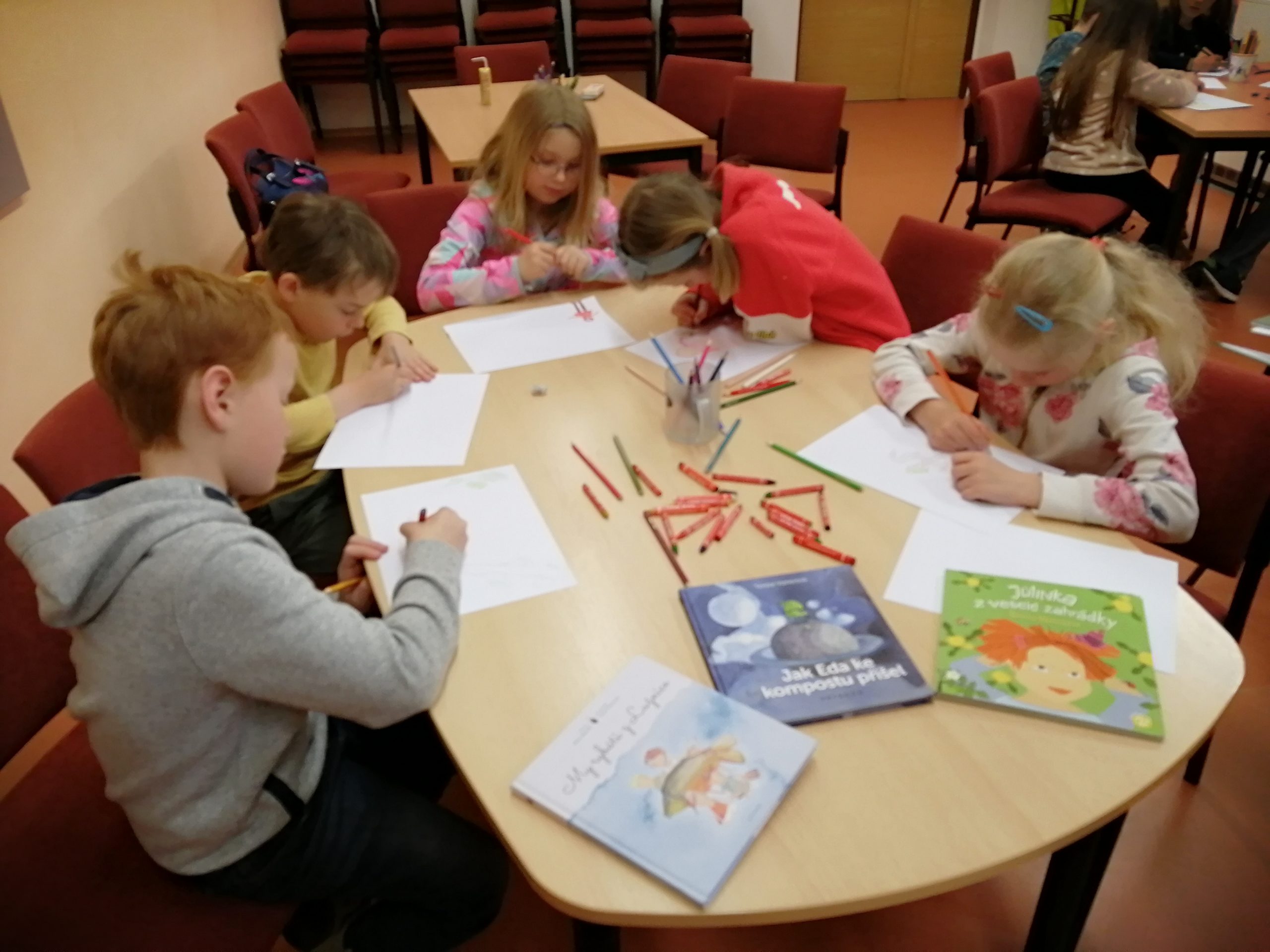 Druháčci Montessori v knihovně. Besedu s ilustrátorkou knihy “Jak Eda ke kompostu přišel” zakončila vlastní tvorba ilustrace pohádky.