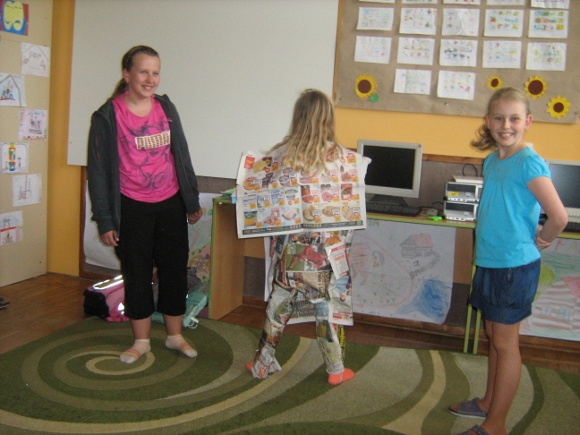 Při hodině pracovních činností jsme vyzkoušeli novou možnost, jak se oblékat. Chlapci a děvčata se rozdělili do skupinek a vždy jednoho ze skupinky oblékli do oblečení z novin. Na závěr hodiny každá skupinka představila svůj model a jeho účel. Viděli jsme modely k běžnému nošení, ale i modely k mimořádným příležitostem. Nejvvypracovanější byly svatební šaty včetně rukavic a střevíčků.