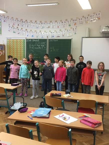 Děti ze 3.B nezapomněly na svátek učitelů. Když jsem vešla do třídy spolu s asistentkou Janou Holečkovou, čekal na nás dárek v podobě písničky a květiny. Všem „našim“ žákům touto cestou děkuji za krásné překvapení.