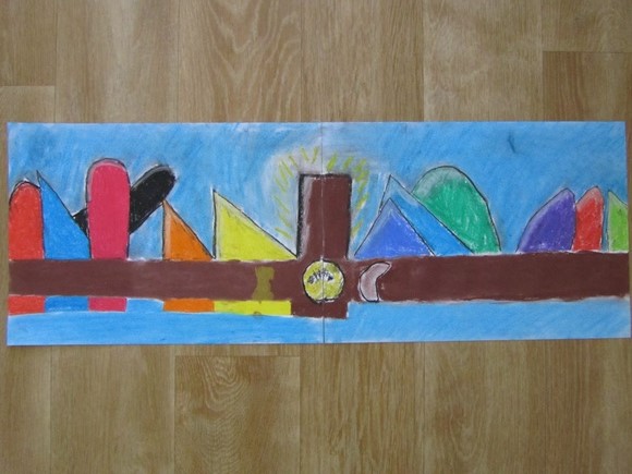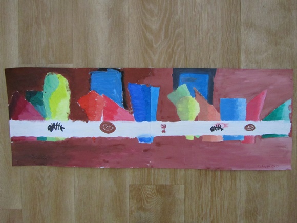 Žáci poté pozorovali fresku a všímali si rozmístění postav. Pokusili se namalovat Poslední večeři jednoduchým způsobem – zjednodušením na geometrické tvary a stínováním, technikou suchý pastel nebo malbou temperou. Pracovali ve dvojicích a vznikla opravdu zajímavá díla. Podívejte se.