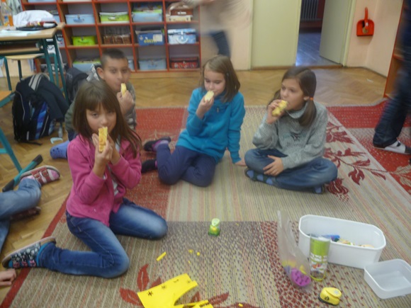 Před Vánoci nás honila „mlsná“ a tak jsme v hodině pracovních činností vyzkoušeli pečení kapra z kynutého těsta. Každý se zapojil a výsledek stál za to. Kapřík se povedl a moc všem chutnal. Abychom při jeho pečení v troubě jen tak nelelkovali, zkusili jsme ještě uvařit vánoční burizonová lízátka na adventní trhy. Ta měla také velký úspěch a jen se po nich zaprášilo.