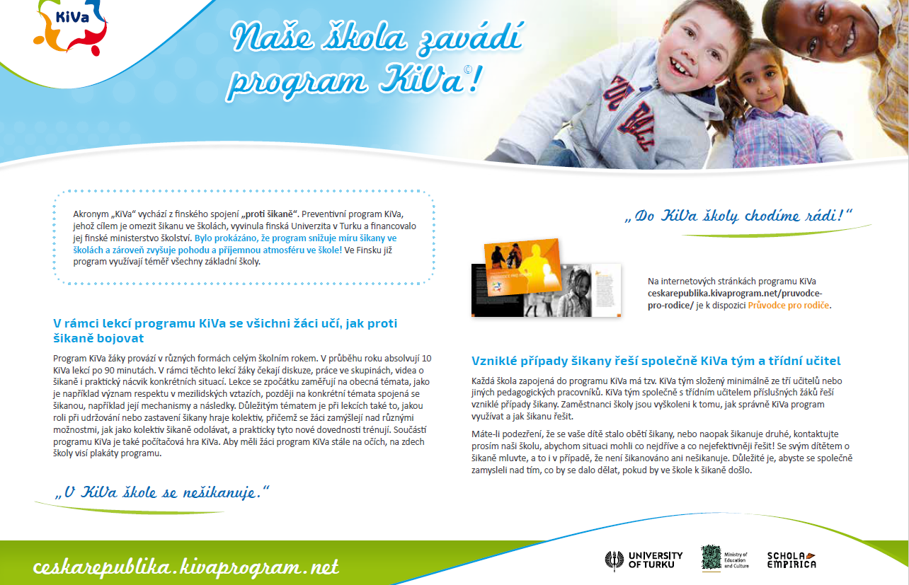 Bližší informace pro rodiče jsou dostupné na webových stránkách: https://ceskarepublika.kivaprogram.net/, kde najdete i průvodce pro rodiče. Případně se můžete i dotazovat koordinátora programu Kiva na ZŠ Na Habru – Pavla Kubíčka (školního metodika prevence).
