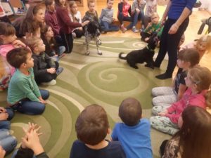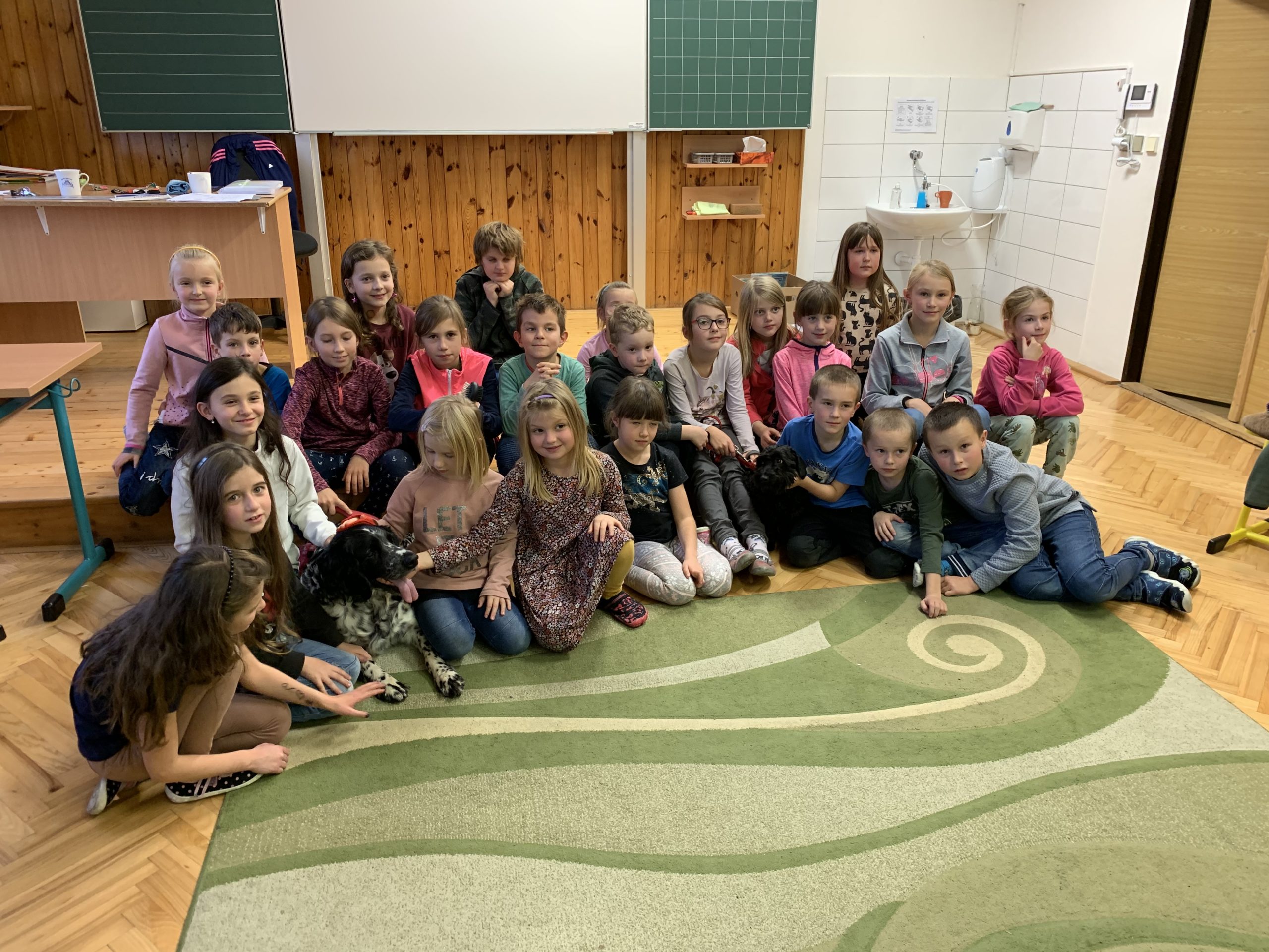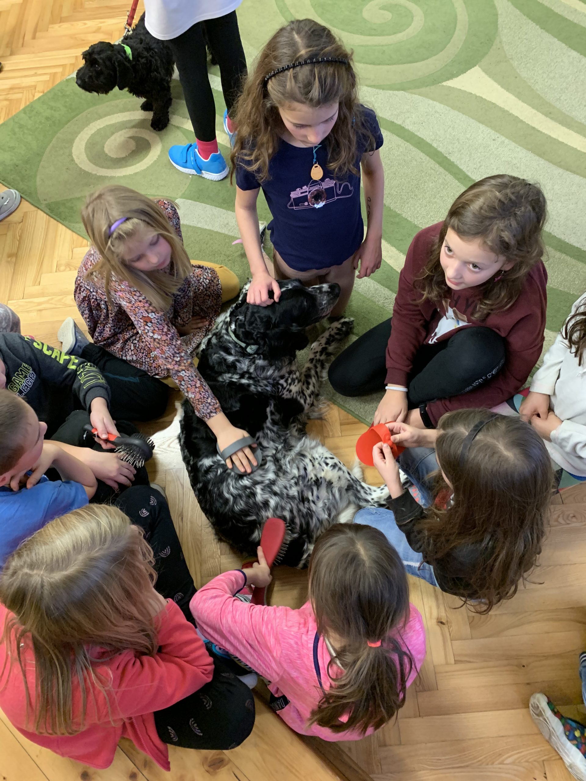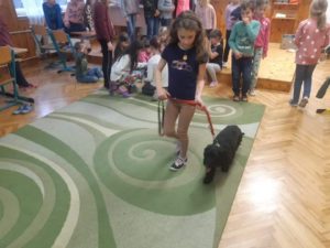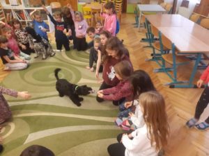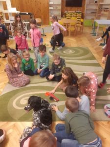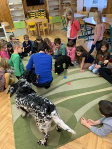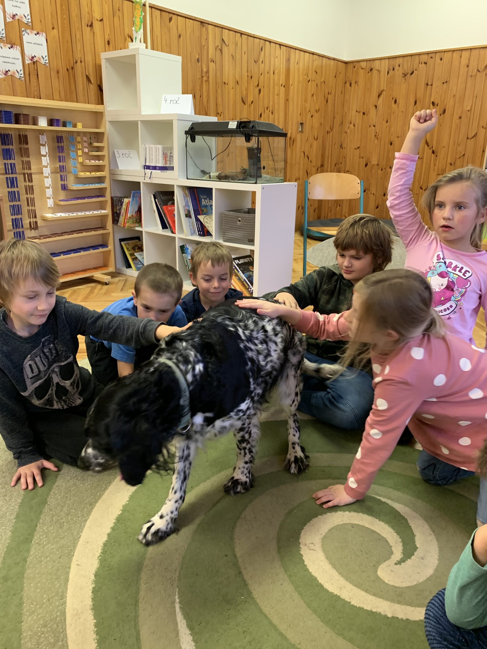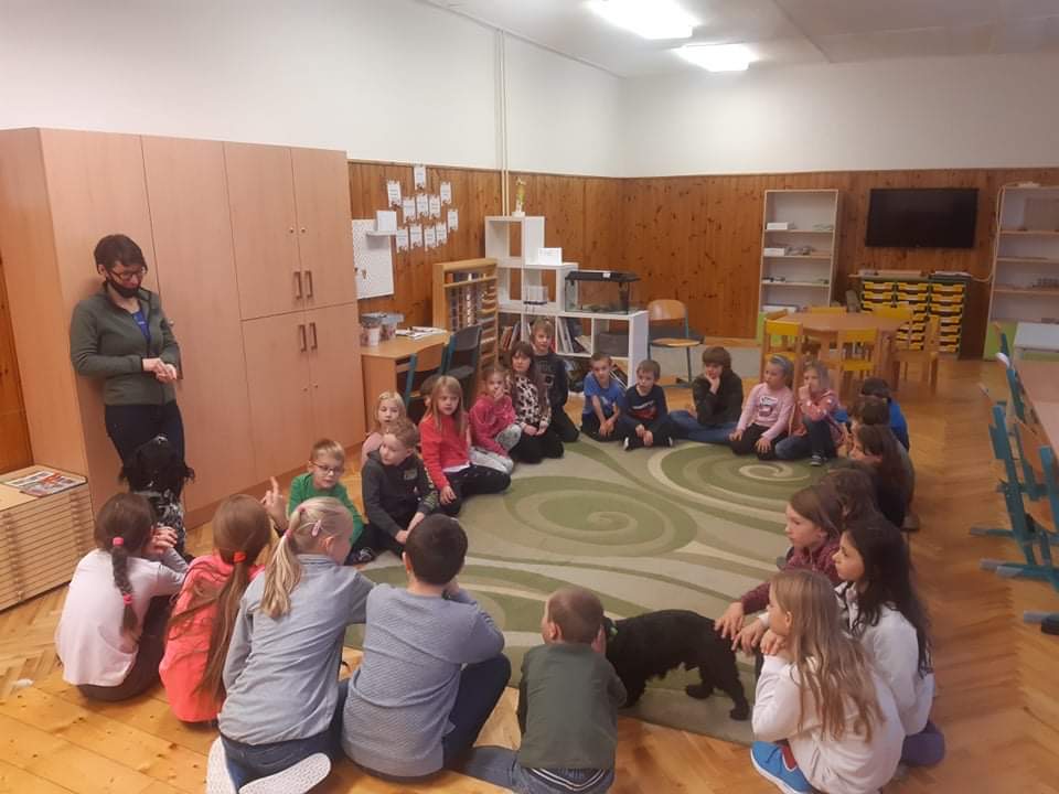 V pátek 12.11. 2021 nás navštívili psí kamarádi. Paní Šádková nám představila svoji práci se pejsky. Řekla nám, co znamená, když pes vrčí a jak vypadá když se pejsek bojí. Také jsme se dozvěděli, co rádi jedí a co naopak jíst nemohou. Nezapomněla podotknout, že cizího psa by si děti neměly všímat a nehladit ho. Děti si vyzkoušely vodění pejska, jeho krmení a kartáčování. Čas strávený se čtyřnohými kamarády nám rychle utekl a všichni jsme si to moc užili.