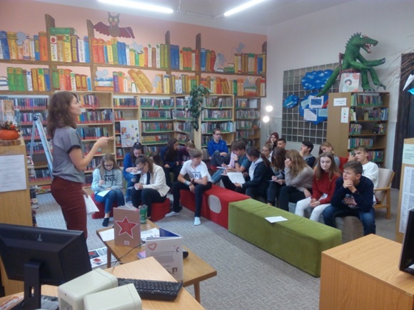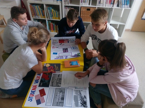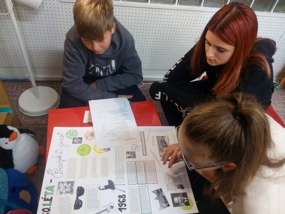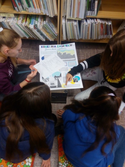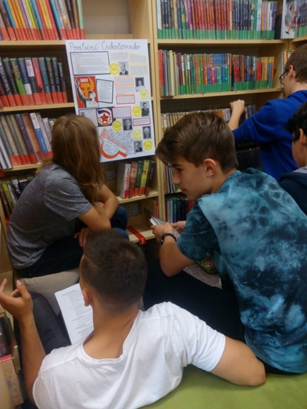 Ano. Projekt, který jsme nazvali Svoboda, začal nabírat na obrátkách. Po návštěvě ZŠ Komenského, kde naši deváťáci zhlédli retro výstavu z 80. let a zkusili si i správně vyluštit kvíz z dobových reálií, zavítali žáci do hořické knihovny. Zde na ně čekala nejen paní učitelka a knihovnice v jedné osobě Jana Srncová, ale zejména zajímavý program. Na šesti stanovištích se žáci seznamovali s výukovými plakáty, které představovaly 6 vývojových etap naší historie vrcholící sametovou revolucí. Získané informace si žáci zapisovali do svých pracovních listů a využili je i při závěrečném přiřazování pojmů a obrázků.