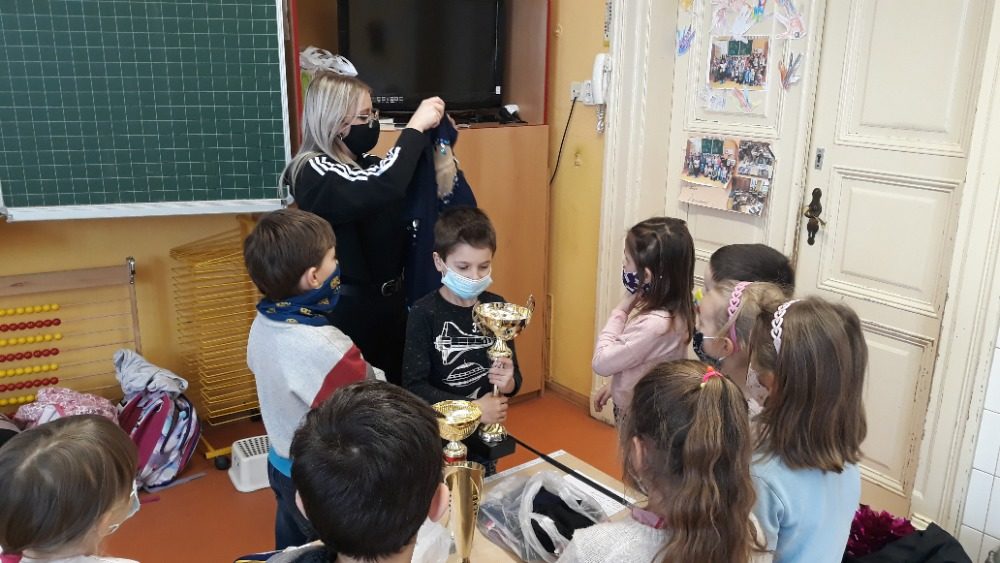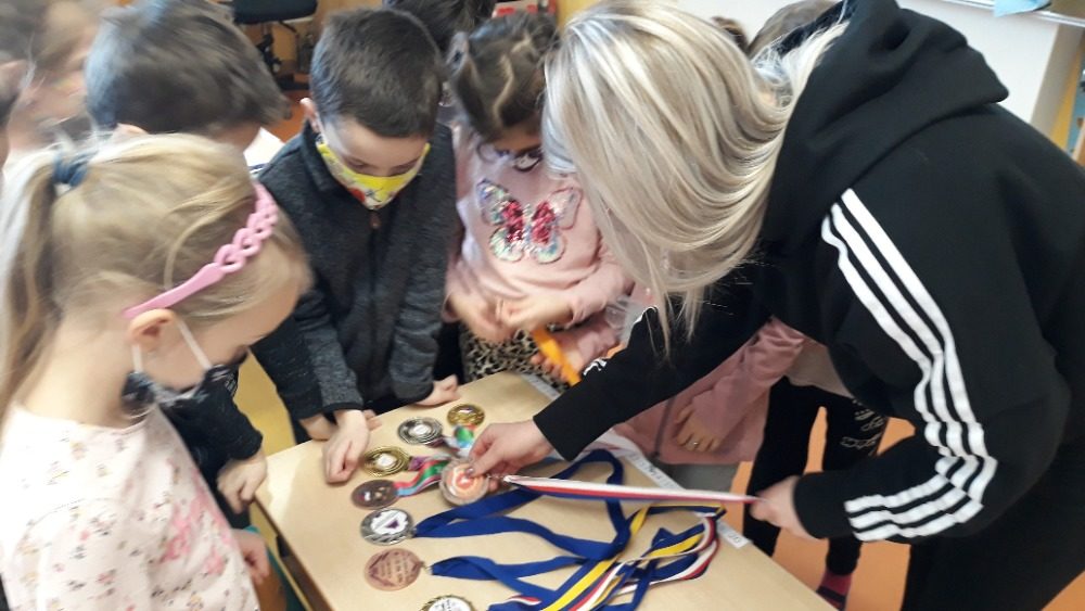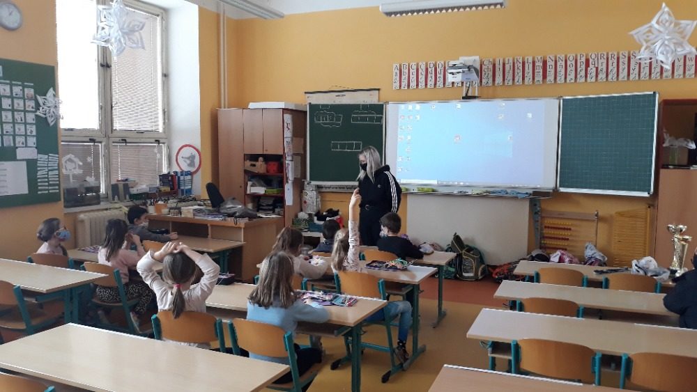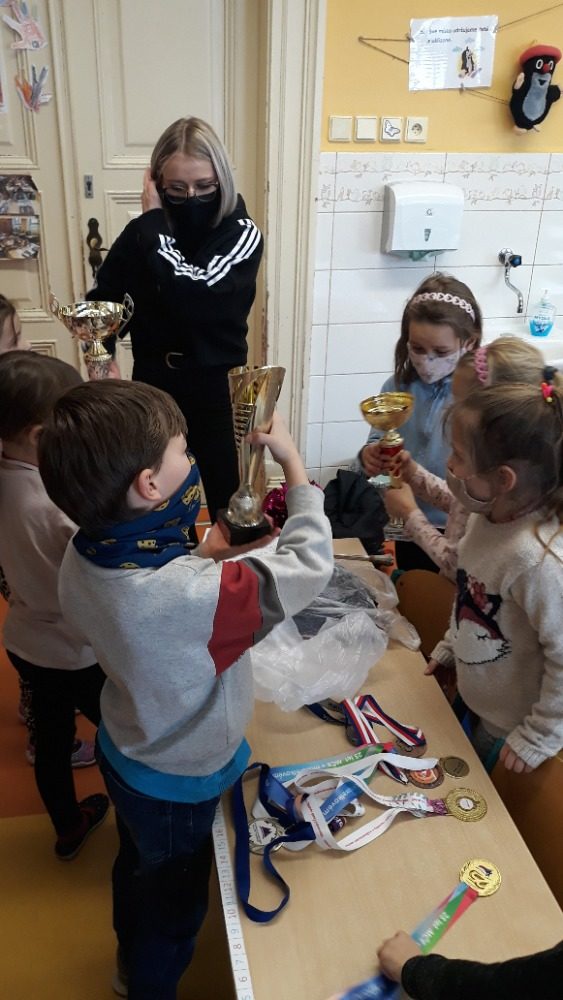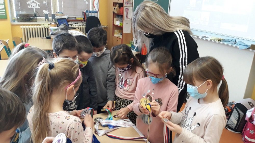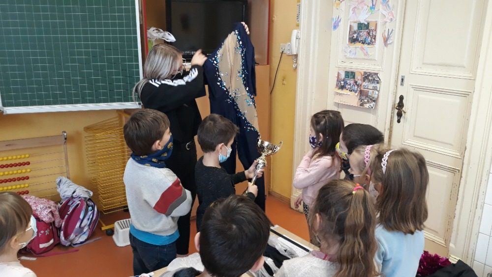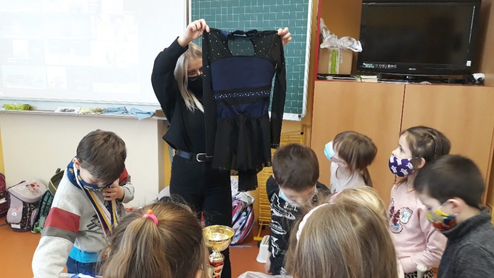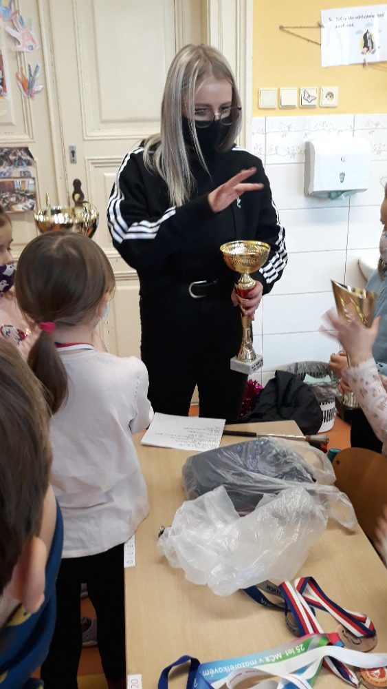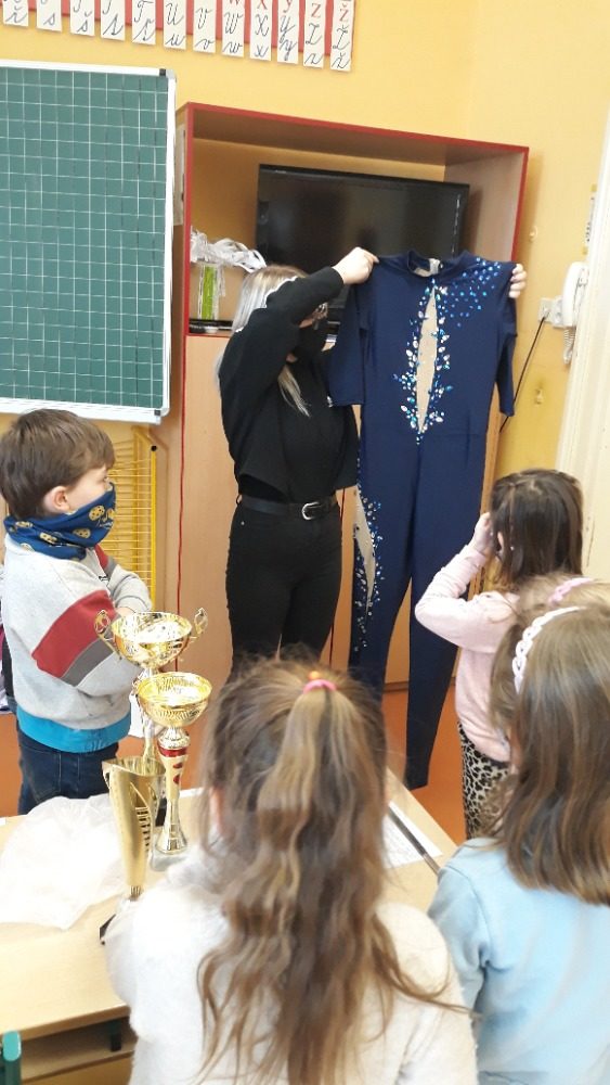 Ve středu 18. 2. 2021 přijala naše pozvání do družiny mažoretka Valérie Kordíková. Valča dětem přiblížila mažoretkový sport, který čerpá z oblasti tance, baletu, gymnastiky a akrobacie. Vysvětlila dětem práci s náčiním (hůlka, pom-pom), kterou si mohly vyzkoušet. Všichni jsme obdivovali její medaile, poháry, fotografie, fotoknihy a videa ze soutěží. Nejvíce prvňáčky zaujalo vystoupení v tělocvičně, kde jim předvedla rozcvičku, část tréninku a ukázku z jejích oblíbených sestav s akrobatickými prvky. V závěru si dívky mohly vyzkoušet kostýmy a také si je samy navrhnout. Valče moc děkujeme za krásné odpoledne a přejeme mnoho sportovních i osobních úspěchů.