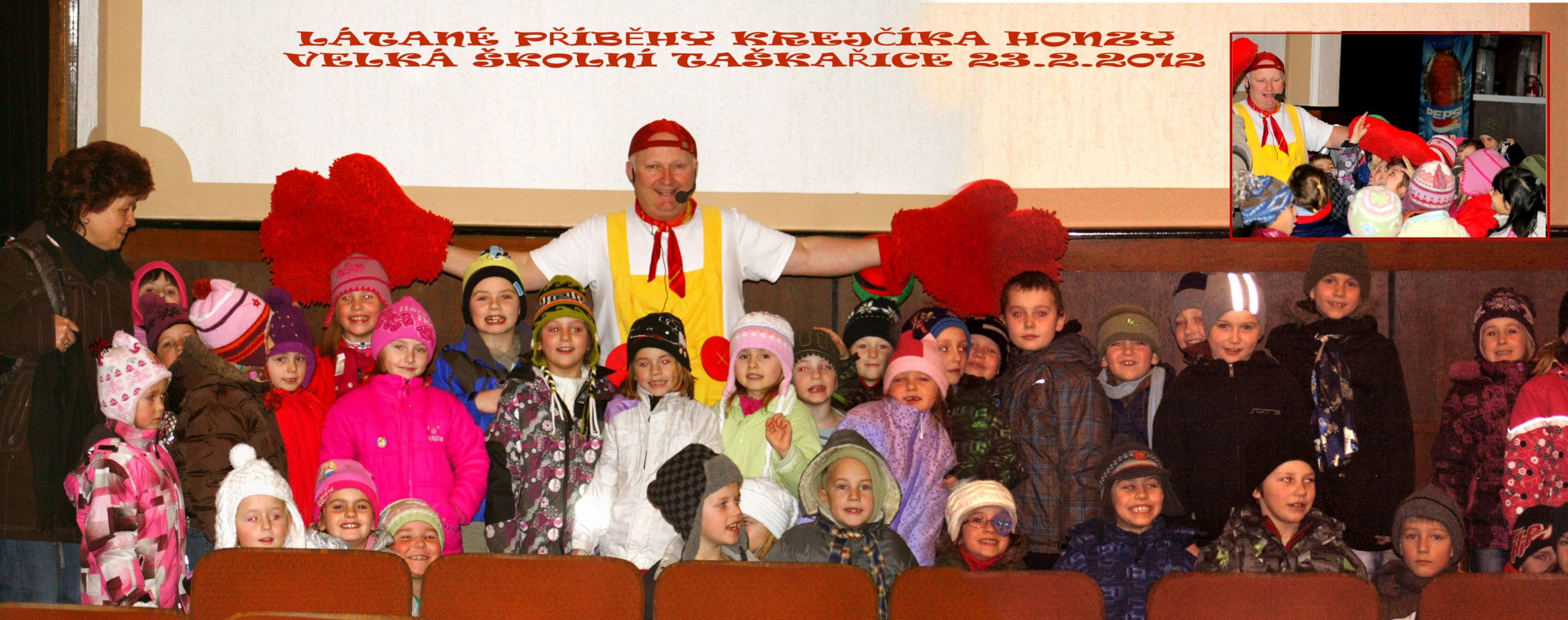 Naši nejmenší žáčci absolvovali v Hořicích již druhé divadelní představení. První písničkový program o staré Praze, se dětem moc líbil. Druhé představení  23.2. se jmenovalo Velká školní taška /řice/ a  protože bylo založeno na aktivní spolupráci s dětmi a o legraci nebyla nouze, dětem se opět velmi líbilo. Na závěr se s námi hlavní hrdina – krejčík Honza – ještě vyfotil.Tak se podívejte, jak se mu mezi námi líbilo. A ty velké ruce, abyste věděli, ty má na veliké pohlazení, po kterém se každý stává ještě hodnějším.