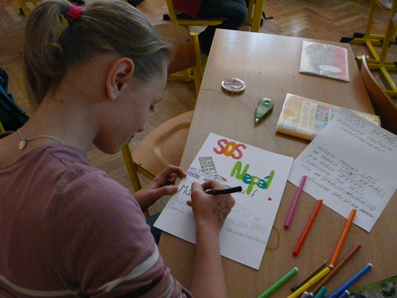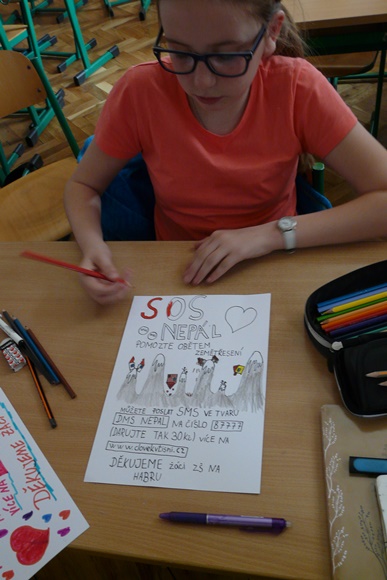 Plakáty vyzývají k pomoci zasažené oblasti formou dárcovské SMS. Zvolili jsme si podpořit Nepál skrze aktivity občanského sdružení Člověk v tísni, které v Nepálu dlouhodobě působí. Někteří žáci neváhali a své povedené plakáty se rozhodli vyfotit a rozeslat po sociálních sítích. Prostě vzali problém do svých rukou a začali jednat.