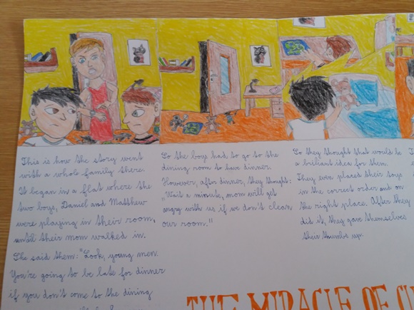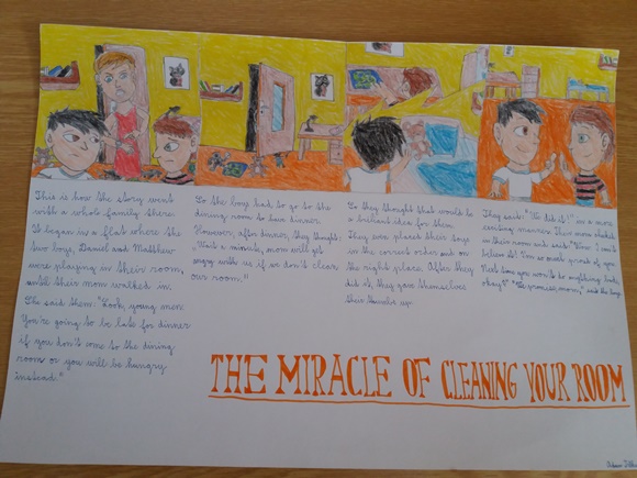 Na základě zadaných obrázků (úvod a závěr) bylo třeba dokreslit dva další a vytvořit příběh, který se odehrál. Adam Trčka (8.třída) vytvořil příběh s názvem “The Miracle of cleaning your room” a doplnil ho zdařilými ilustracemi. Budeme držet pěsti, aby krátký příběh ve velké konkurenci uspěl.