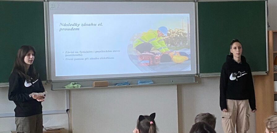Výběr žáků z 9. B navštívil kamarády z patra. Deváťáci seznámili 3. třídu se základy bezpečné práce se spotřebiči, s kterými se doma běžně potkávají a manipulují s nimi. Na projektu pracovali již dříve v hodinách fyziky. Měli volnou ruku, jediným kritériem byl dětský věk obecenstva. I proto se mohl závěrečným zpestřením stát autorský film z dílny Bernard – Čapek.