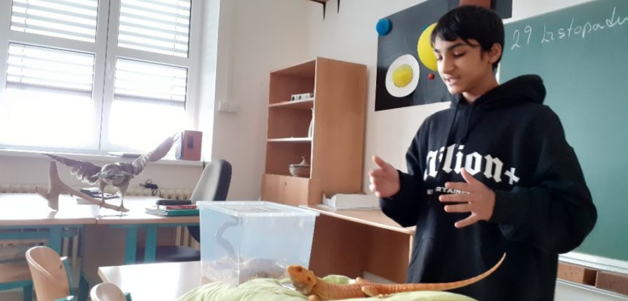 Dnes zažili žáci 7. B mimořádnou hodinu přírodopisu. Michal Zajac si totiž připravil bezvadný referát na téma Plazů. Přinesl nám k němu na ukázku hned 3 živé tvory, a to: želvu vroubenou, užovku červenou a agamu. Nejenže si všechny živočichy mohli žáci pohladit a vzít do ruky, ale dozvěděli se o nich také řadu zajímavostí. Již tak vědí, že želva …