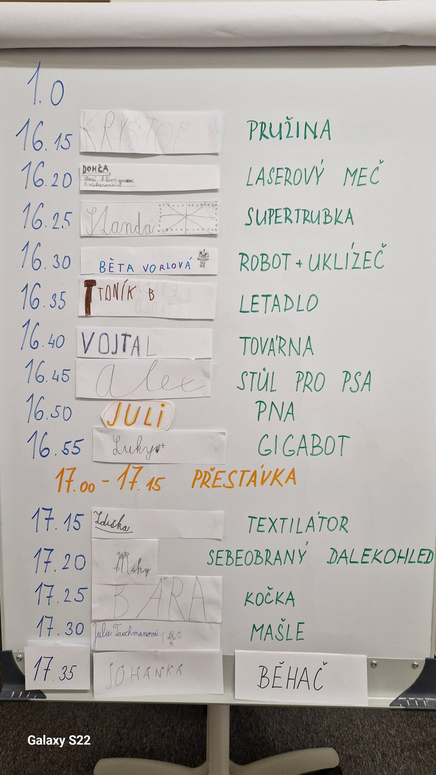 Každý rok se 17. ledna slaví Den dětských vynálezů. My jsme jej chtěli podpořit také, a proto se děti celý tento měsíc zabývaly vymýšlením originálních zlepšovátek a drobných vynálezů. Jejich nápady byly ohromující. Vznikl třeba prototyp robůtka na hlídání rodičů, super vidlička na velká sousta, ovladač korýšů, skládací klouzačka, orientík na promítání souhvězdí. Ve středu 5. 2. děti všechny vynálezy statečně představily svým rodičům.
