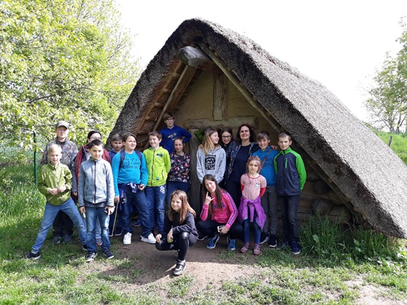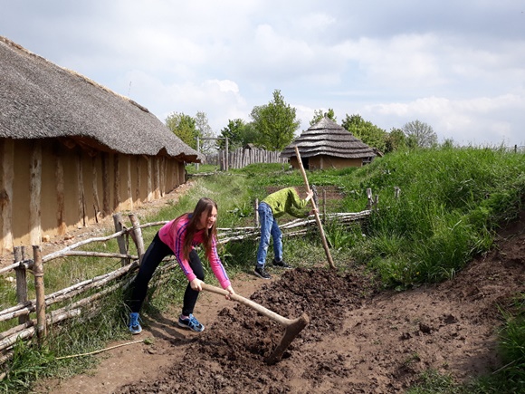 V druhé části exkurze jsme se přesunuli do venkovního areálu. Tady si šesťáci prohlédli nejstarší obydlí našich předků a dozvěděli se hodně i o práci archeologů. Viděli jsme pece na vypalování keramiky i pec na tavení železa. Nejvíce se však žákům líbila možnost vyzkoušet si život našich předků v praxi. A tak po instruktáži od paní průvodkyně okopávali a ryli políčko, házeli oštěpem na cíl, mleli mouku na kamenném mlýnku nebo brousili kamenné nástroje. Dívky si také vyzkoušely tkaní látek. Žáci brzy zjistili, jak těžký život v pravěku byl, ale nevzdali se. Chlapci i dívky prokázali vytrvalost, zručnost i nadšení a brzy se jim v těchto nezvyklých disciplínách začalo dařit.