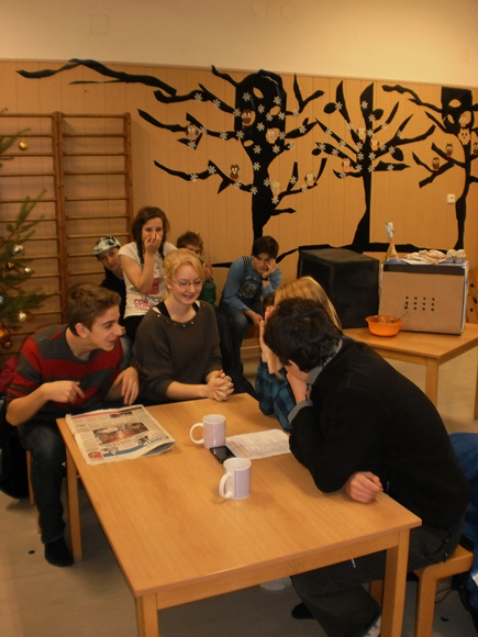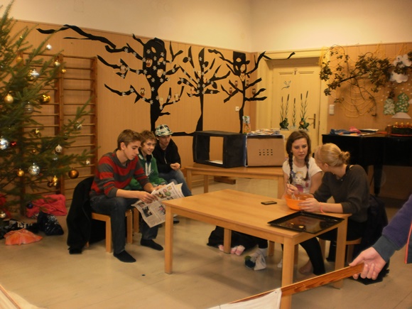 Jako každý rok jsme se i letos před Vánoci s deváťáky vydali do MŠ Na Habru za našimi malými kamarády. Tentokrát si pro ně žáci 9.A připravili pohádku o dvou rozhádaných rodinách, které si již dlouho dělají samé naschvály. Jak to tak ale před Vánoci (a v pohádkách) chodí, rodiny se nakonec usmířily a strávily Vánoce společně. V průběhu příběhu si děti mohly zopakovat, jaké tradice a zvyky se na Vánoce dodržují a jaké chování je a není správné. Celý příběh od sepsání, přes rozdělení rolí, přípravu kulis a dekorací až po vlastní vystoupení si deváťáci přichystali zcela sami. Vymyšlení příběhu se ujala trojice dívek – Barča Baliharová, Barča Jančáková a Viki Vaňurová, ve vlastním divadle pak vystupovali téměř všichni žáci třídy.